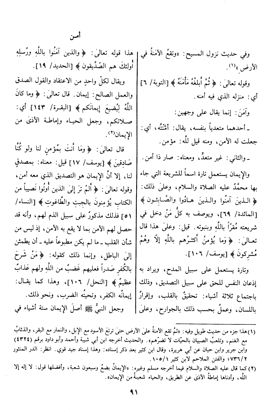 ويقال لكلّ واحد من الاعتقاد والقول الصدق والعمل الصالح: إيمان. قال تعالى: وَما كانَ اللَّهُ لِيُضِيعَ إِيمانَكُمْ [البقرة/ 143] أي: