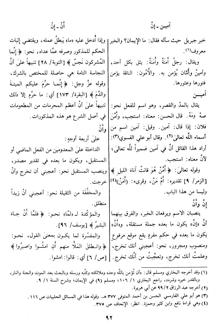 إِنَّ أَنَّ ينصبان الاسم ويرفعان الخبر، والفرق بينهما أنّ «إِنَّ» يكون ما بعده جملة مستقلة، و «أَنَّ» يكون ما بعده في حكم مفرد يقع موقع مرفوع ومنصوب ومجرور، نحو: أعجبني أَنَّك تخرج، وعلمت أَنَّكَ تخرج، وتعجّبت من أَنَّك تخرج. وإذا أدخل عليه «ما» يبطل عمله، ويقتضي إثبات الحكم للمذكور وصرفه عمّا عداه، نحو: إِنَّمَا الْمُشْرِكُونَ نَجَسٌ