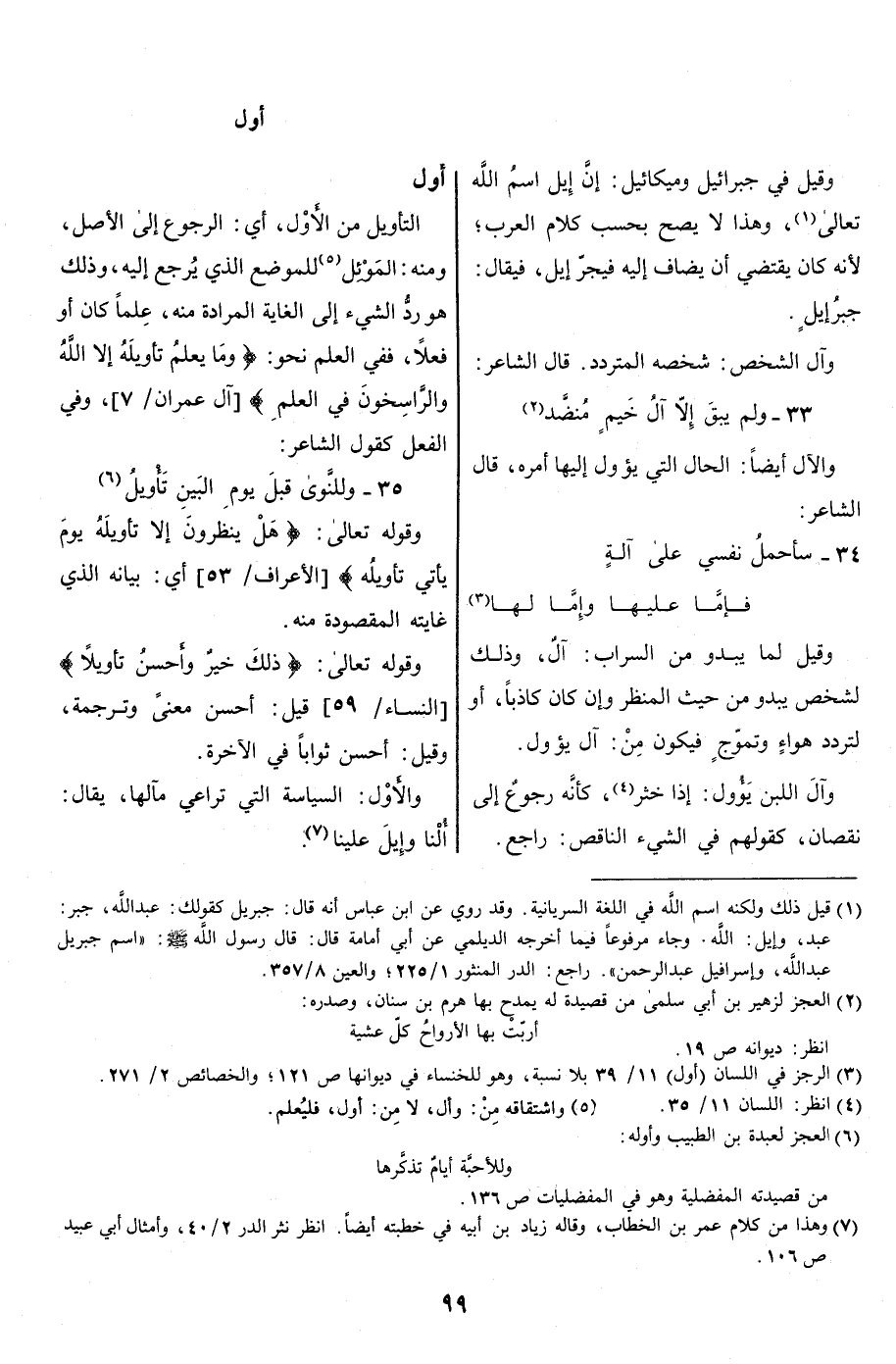 التأويل من الأول، أي: الرجوع إلى الأصل، ومنه: المَوْئِلُ للموضع الذي يرجع إليه، وذلك هو ردّ الشيء إلى الغاية المرادة منه، علما كان أو فعلا، ففي العلم نحو: وَما يَعْلَمُ تَأْوِيلَهُ إِلَّا اللَّهُ وَالرَّاسِخُونَ فِي الْعِلْمِ [آل عمران/ 7] ، وفي الفعل كقول الشاعر: