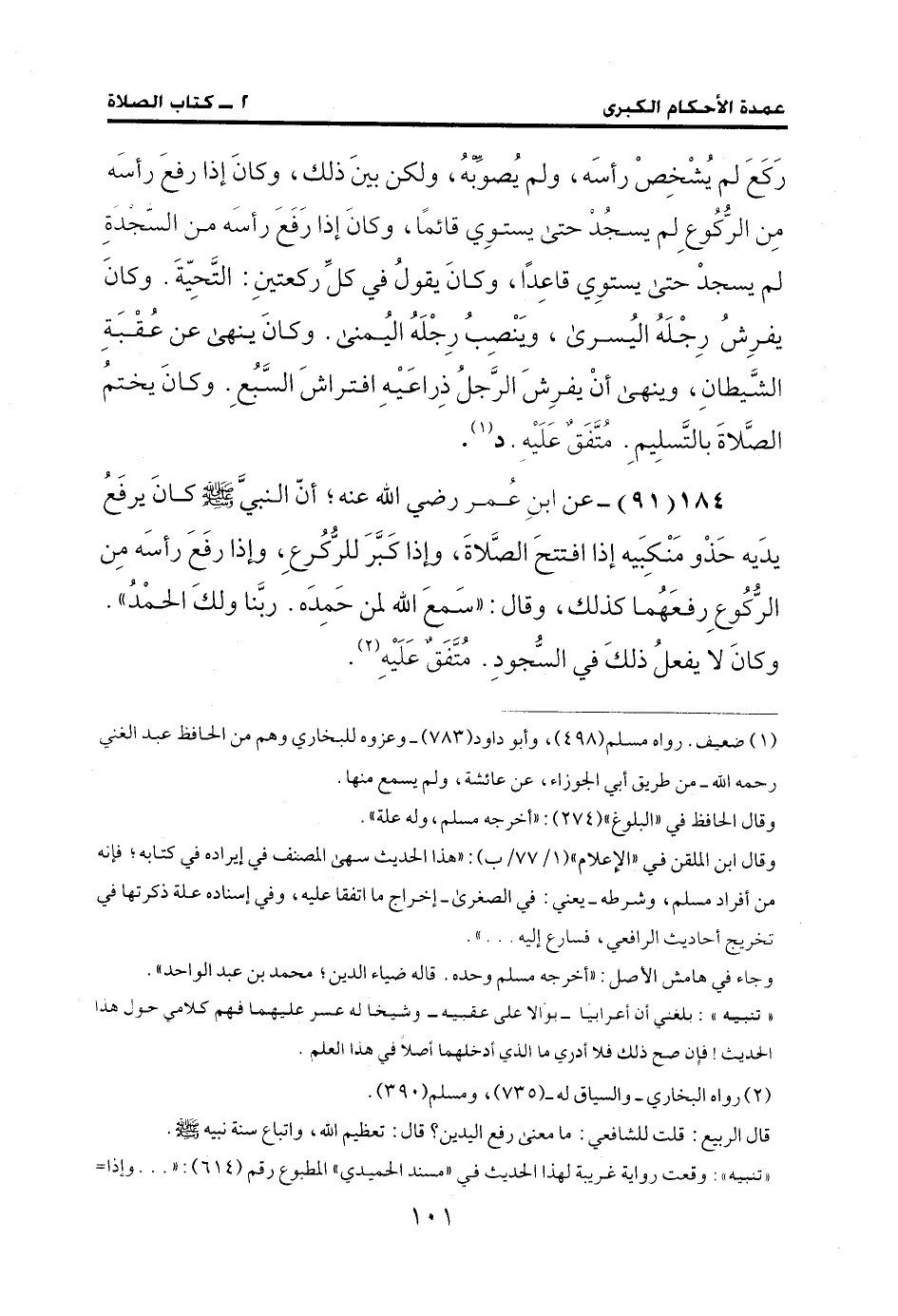 184 (91) - عن ابنِ عُمر رضي الله عنه؛ أنّ النبيَّ - صلى الله عليه وسلم - كانَ يرفَعُ يدَيه حَذْو مَنْكِبَيه إذا افتتحَ الصَّلاةَ، وإذا كَبَّرَ للرُّكُوعِ، وإذا رفَعَ رأسَه مِن الرُّكُوع رِفعَهُما كذلك، وقال: "سَمعَ الله لمن حَمِدَه. ربَّنا ولكَ الحمْدُ". وكانَ لا يفعلُ ذلكَ في السُّجودِ. مُتَفَقٌّ عَلَيْهِ (¬2).