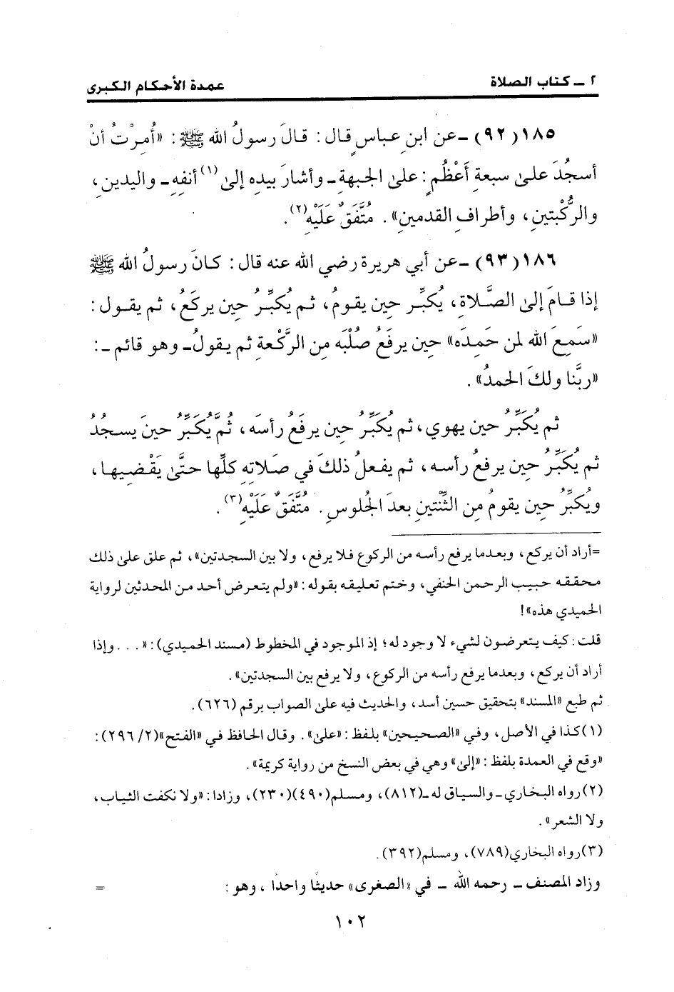 185 (92) - عن ابنَ عباسٍ قال: قالَ رسولُ الله - صلى الله عليه وسلم -: "أُمِرتُ أنْ أسجُدَ علي سبعةِ أَعْظُمٍ: علي الجبهةِ - وأشارَ بيدِه إلى (¬1) أنفِهِ - واليدينِ، والرُّكبتينِ، وأطراف القدمين". مُتَّفَقٌ عَلَيْهِ (¬2).