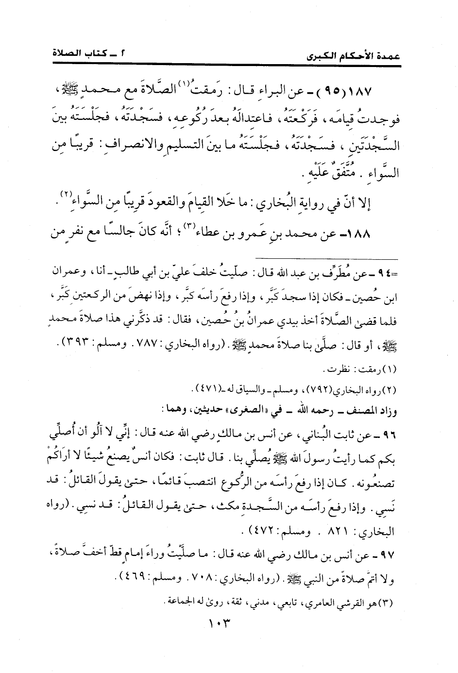 187 (95) - عن البراءِ قال: رَمقتُ (¬1) الصَّلاةَ مع محمدٍ - صلى الله عليه وسلم -، فوجدتُ قِيامَه، فَرَكْعَتَهُ، فاعتِدالَهُ بعدَ رُكُوعِهِ، فسَجْدَتَهُ، فجَلْسَتَهُ بينَ السَّجْدَتَينِ، فسَجْدَتَهُ، فجَلْسَتَهُ ما بينَ التسليمِ والانصرافِ. قريبًا مِن السَّواءِ. مُتَّفَقٌ عَلَيْهِ.