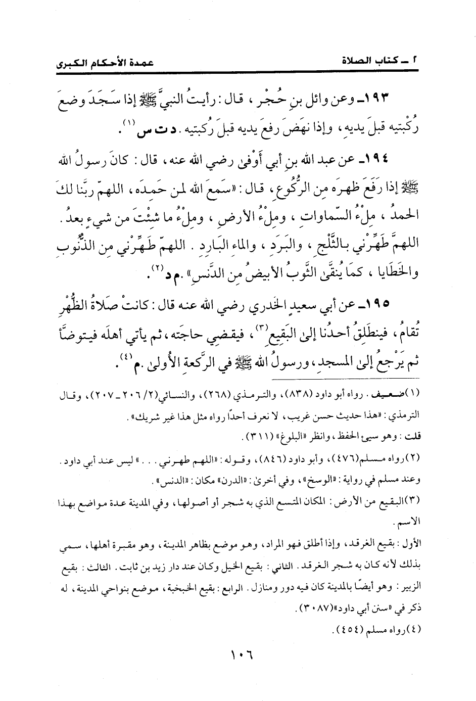 193 - وعن وائل بنِ حُجْر، قال: رأيتُ النبيَّ - صلى الله عليه وسلم - إذا سَجَدَ وضعَ رُكبتيه قبلَ يديهِ، وإذا نهَضَ رفعَ يديه قبلَ رُكبتيه. د ت س (¬1).