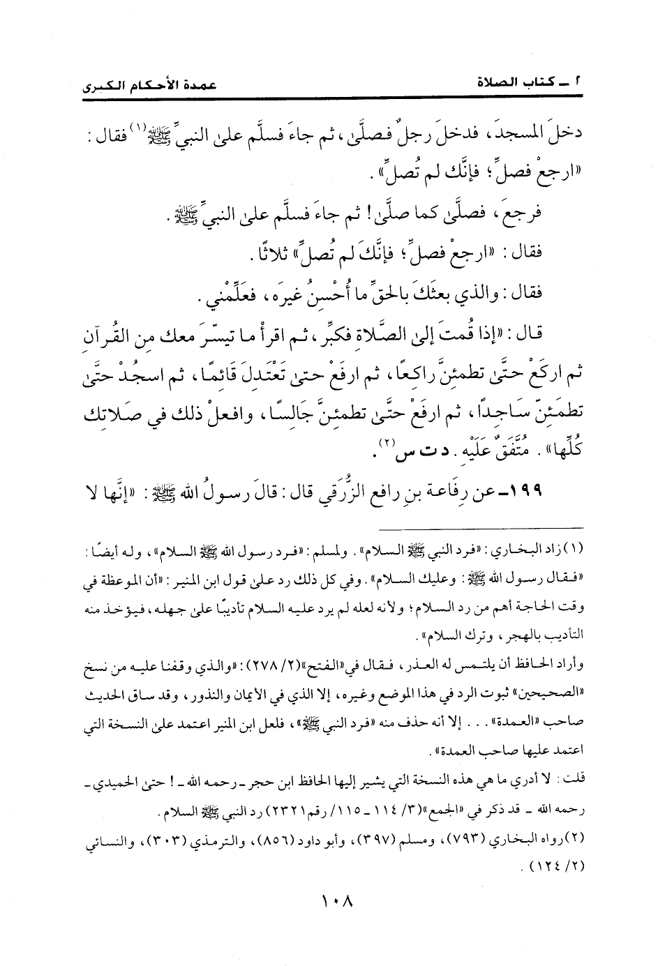 قال: "إذا قُمتَ إلى الصَّلاةِ فكبَّر، ثم اقرأْ ما تيسّرَ معك مِن القُرآنِ ثم اركَعْ حتَى تطمئِنَّ راكِعًا، ثم ارفَعْ حتى تَعْتَدِلَ قَائِمًا، ثم اسجُدْ حتَّى تطمَئِنّ سَاجِدًا، ثم ارفَعْ حتَّى تطمئِنَّ جَالِسًا، وافعل ذلك في صَلاتك كُلِّها". مُتَفَقٌ عَلَيْهِ. د ت س (¬2).