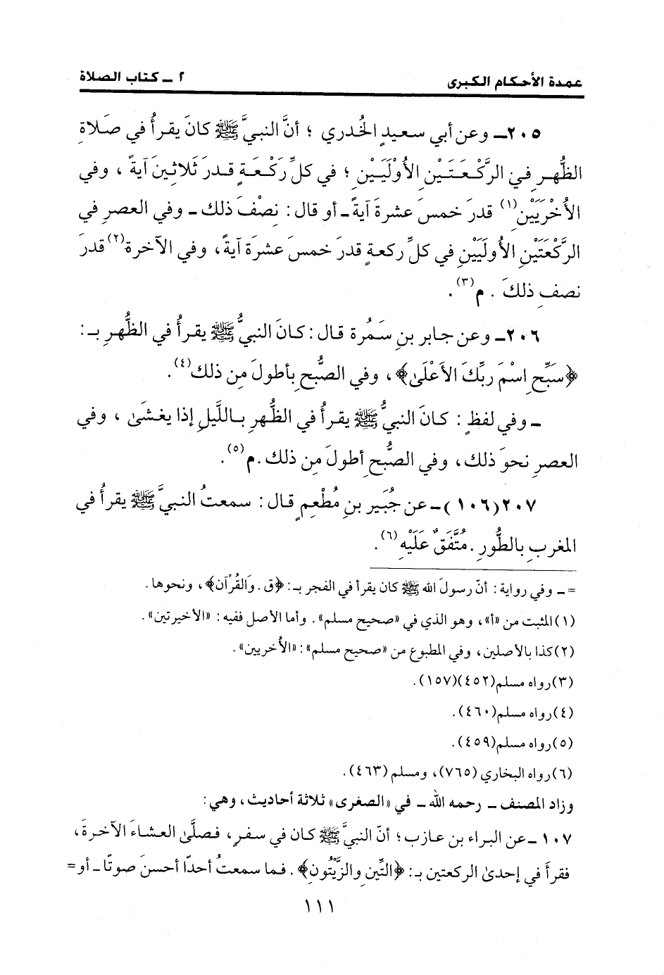 207 (106) - عن جُبَير بنِ مُطْعِمٍ قال: سمعتُ النبيَّ - صلى الله عليه وسلم - يقرأُ في المغربِ بالطُّورِ. مُتَّفَقٌ عَلَيْهِ (¬6).