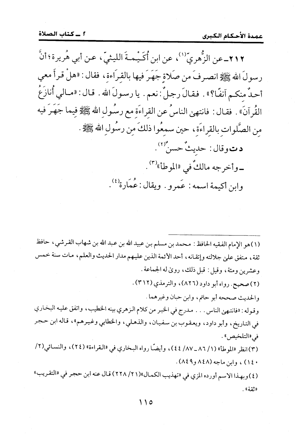 212 - عن الزُّهريّ (¬1)، عن ابن أُكَيْمةَ الليثيّ، عن أبي هريرة؛ أنَّ رسولَ الله - صلى الله عليه وسلم - انصرفَ من صَلاةٍ جَهَرَ فيها بالقِرَاءةِ، فقال: "هلْ قرأَ معي أحدٌ مِنكم آنفًا؟ ". فقالَ رجلٌ: نعم. يَا رسولَ الله. قال: "مالي أُنازعُ القُرآنَ". فقال: فانتهى النَّاسُ عن القِراءَةِ مع رسُولِ الله - صلى الله عليه وسلم - فِيما جَهَرَ فيه مِن الصَّلواتِ بالقِراءَةِ، حين سمِعُوا ذلكَ مِن رسُولِ الله - صلى الله عليه وسلم -.