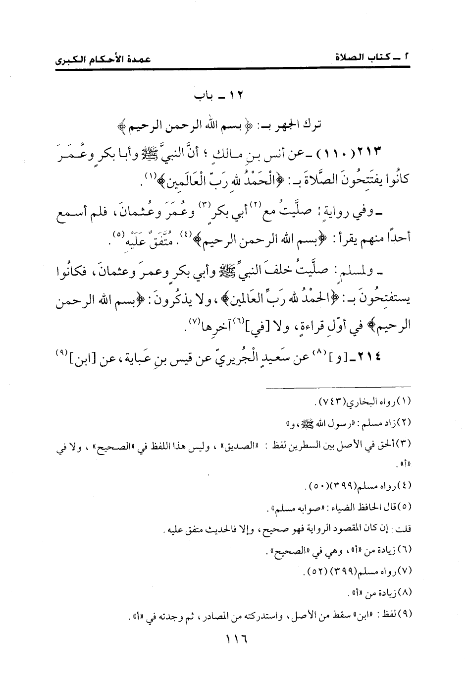 213 (110) - عن أنس بنِ مالك؛ أنَّ النبيَّ - صلى الله عليه وسلم - وأبا بكرٍ وعُمَرَ كانُوا يفتَتِحُونَ الصَّلاةَ بـ: {الْحَمْدُ لِلَّهِ رَبِّ الْعَالَمِينَ (2)} (¬1).