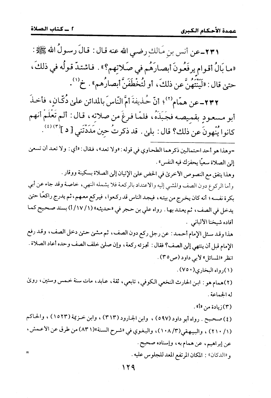 231 - عن أنس بنِ مَالك رضي الله عنه قال: قالَ رسولُ الله - صلى الله عليه وسلم -: "ما بَالُ أقوامٍ يرفَعُونَ أبصارَهُم في صَلاتِهم؟ ". فاشتدّ قولُه في ذلكَ، حتى قال: "لَيَنْتَهُنَّ عن ذلكَ، أو لتُخْطَفَنَّ أبصارُهم". خ (¬1).