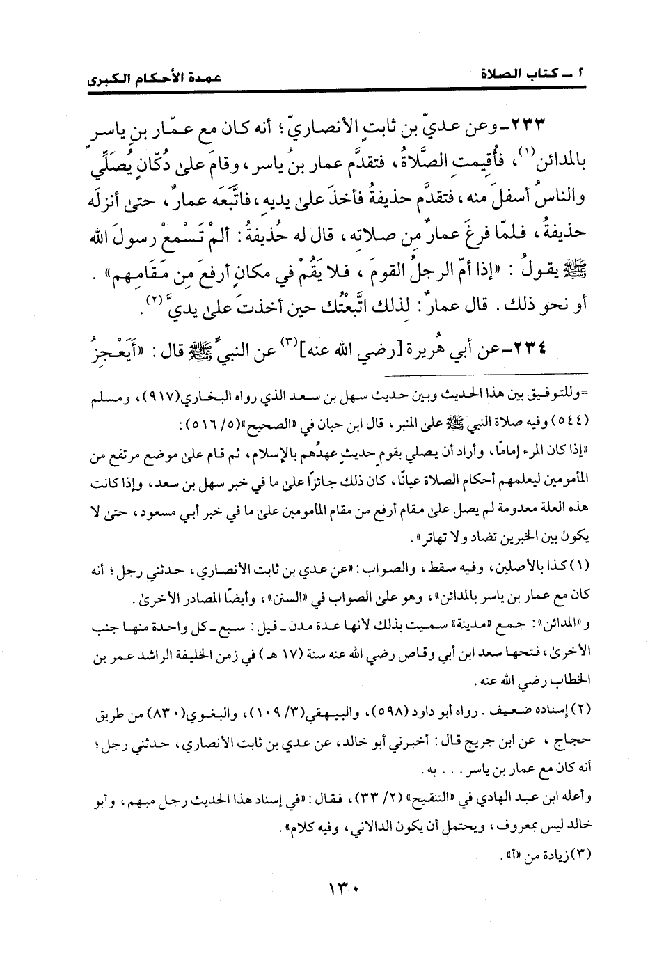 233 - وعن عديّ بن ثابتٍ الأنصاريّ؛ أنه كان مع عمّار بنِ ياسرٍ بالمدائن (¬1)، فأُقِيمتِ الصَّلاةُ، فتقدَّم عمار بنُ ياسر، وقامَ على دُكّانٍ يُصَلِّي والناسُ أسفلَ منه، فتقدَّم حذيفةُ فأخذَ على يديهِ، فاتّبَعَه عمارٌ، حتى أنزلَه حذيفةُ، فلمّا فرغَ عمارٌ مِن صلاتِه، قال له حُذيفةُ: ألمْ تَسْمَعْ رسولَ الله - صلى الله عليه وسلم - يقولُ: "إذا أمّ الرجلُ القومَ، فلا يَقُمْ في مكانٍ أرفعَ مِن مَقَامهم". أو نحو ذلك. قال عمارٌ: لِذلك اتَّبعْتُك حين أخذتَ على يديَّ (¬2).