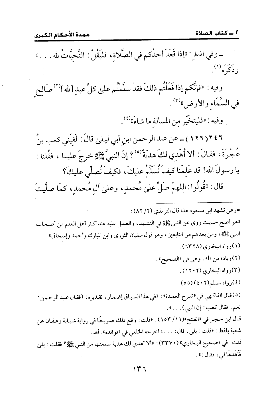 246 (126) - عن عبد الرحمن ابنِ أبي ليلى قالَ: لَقِيَني كعب بنُ عُجْرَةَ، فقالَ: ألا أُهْدِي لكَ هديّةً (¬5)؟ إنّ النبيَّ - صلى الله عليه وسلم - خرجَ علينا، فقُلنا: يا رسولَ الله! قد عَلِمْنا كيفَ نُسَلِّمُ عليكَ، فكيفَ نُصلِّي عليكَ؟