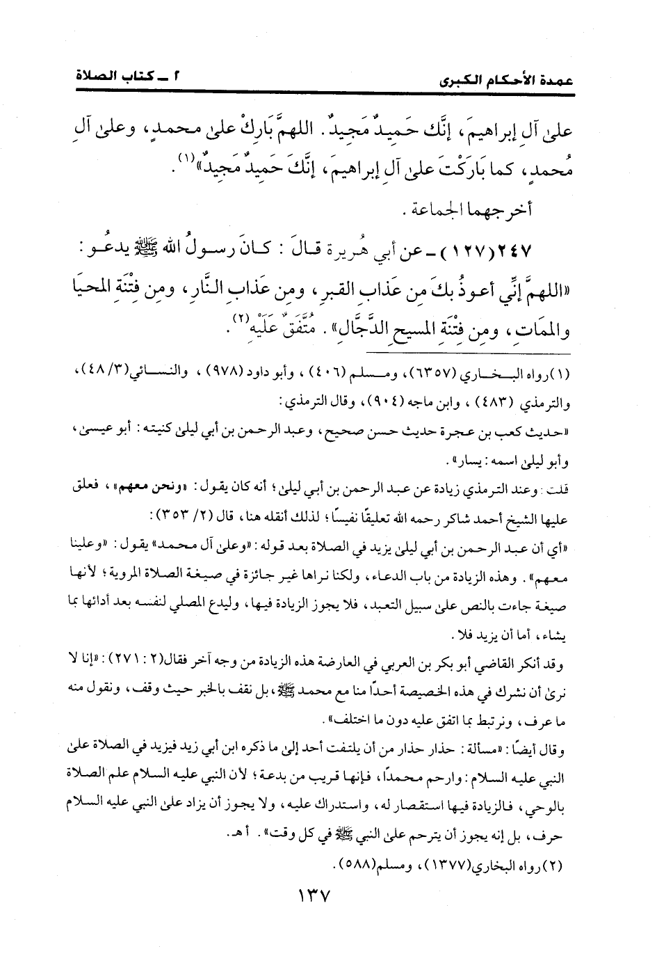 "أي أن عبد الرحمن بن أبي ليلى يزيد في الصلاة بعد قوله: "وعلى آل محمَّد" يقول: "وعلينا معهم". وهذه الزيادة من باب الدعاء، ولكنا نراها غير جائزة في صيغة الصلاة المروية؛ لأنها صيغة جاءت بالنص على سبيل التعبد، فلا يجوز الزيادة فيها, وليدع المصلي لنفسه بعد أدائها بما يشاء، أما أن يزيد فلا.