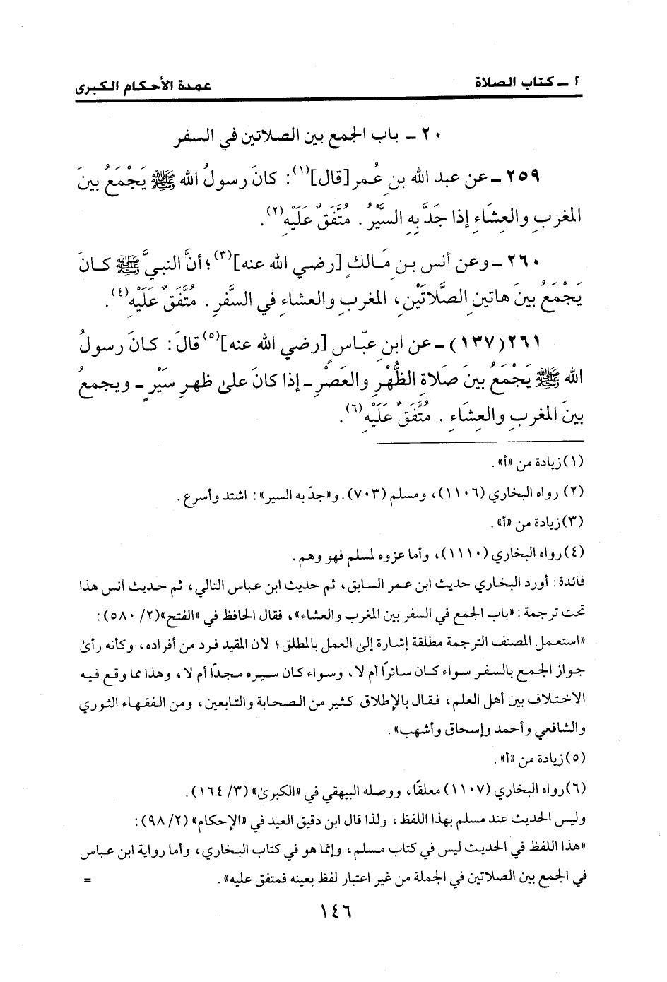 261 (137) - عن ابنِ عبّاسِ [رضي الله عنه] (¬5) قالَ: كانَ رسولُ الله - صلى الله عليه وسلم - يَجْمَعُ بينَ صَلاة الظُّهْرِ والعَصرِ- إذا كانَ على ظهرِ سَيْر- ويجمعُ بينَ المغربِ والعِشَاءِ. مُتَّفَقٌ عَلَيْهِ (¬6).