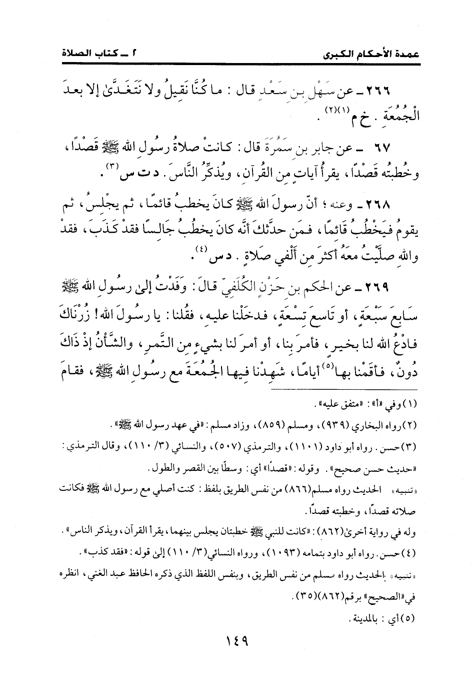 67 - عن جابر بنِ سَمُرَةَ قال: كانتْ صلاةُ رسُولِ الله -صلى الله عليه وسلم- قَصْدًا، وخُطبتُه قَصْدًا، يقرأُ آياتٍ مِن القُرآنِ، ويُذكِّرُ النَاسَ. د ت س (¬3).