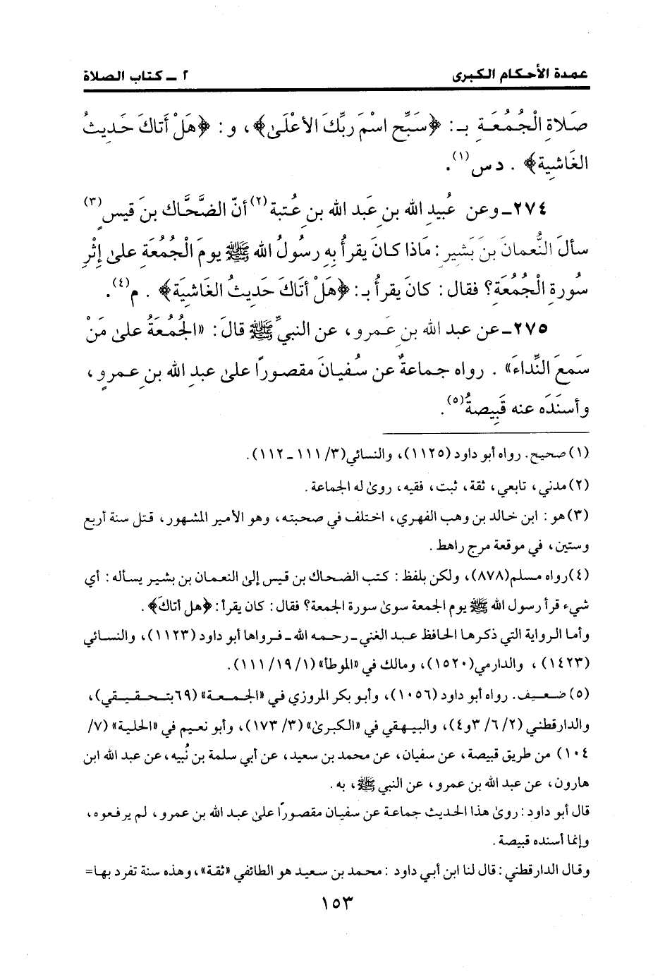 274 - وعن عُبيدِ الله بنِ عَبد الله بنِ عُتبة (¬2) أنّ الضَّحَاك بنَ قيسٍ (¬3) سألَ النُّعمان بن بَشير: مَاذا كانَ يقرأُ بِهِ رسُول الله - صلى الله عليه وسلم - يومَ الْجُمُعَةِ على إِثْرِ سُورةِ الْجُمُعَةِ؟ فقال: كانَ يقرأُ بـ: {هَلْ أَتَاكَ حَدِيثُ الْغَاشِيَةِ}. م (¬4).