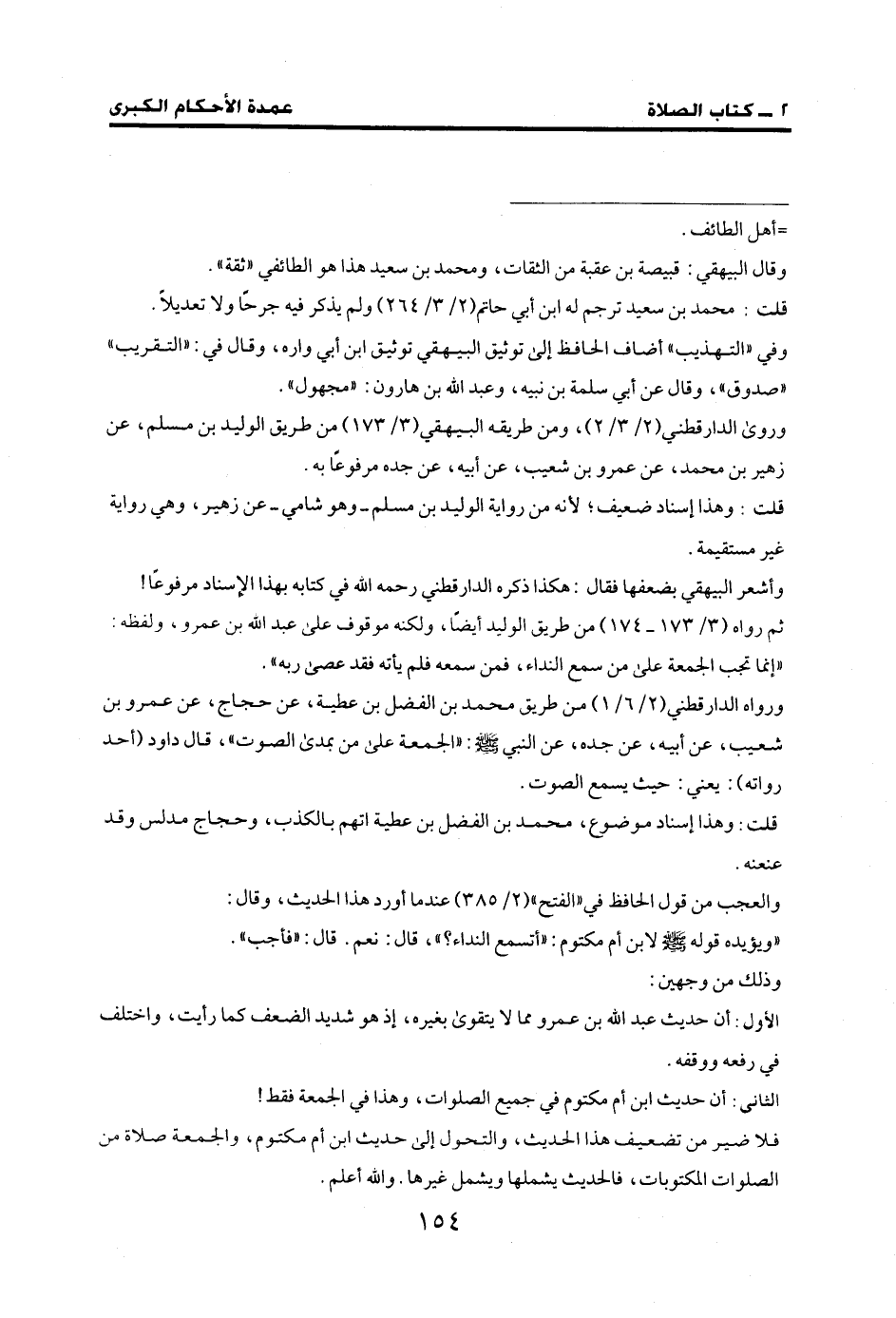 فلا ضير من تضعيف هذا الحديث، والتحول إلى حديث ابن أم مكتوم، والجمعة صلاة من الصلوات المكتوبات، فالحديث يشملها ويشمل غيرها. والله أعلم.
