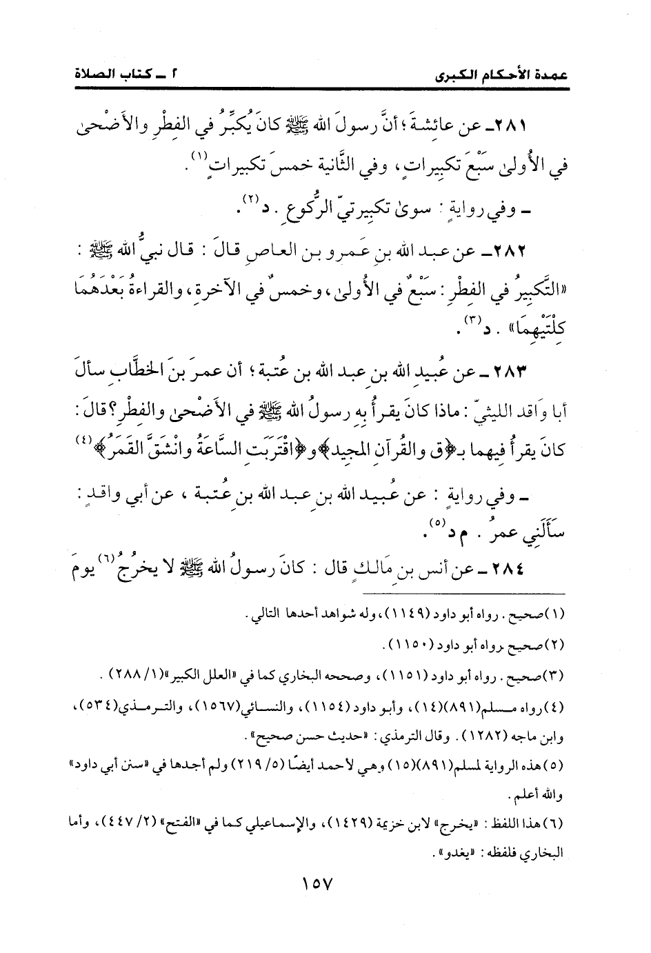 282 - عن عبد الله بنِ عَمرو بن العاصِ قالَ: قال نبيُّ الله - صلى الله عليه وسلم -: "التَكبِيرُ في الفِطْرِ: سَبْعٌ في الأُولى، وخمسٌ في الآخرةِ، والقراءةُ بَعْدَهُمَا كِلْتَيْهِمَا". د (¬3).