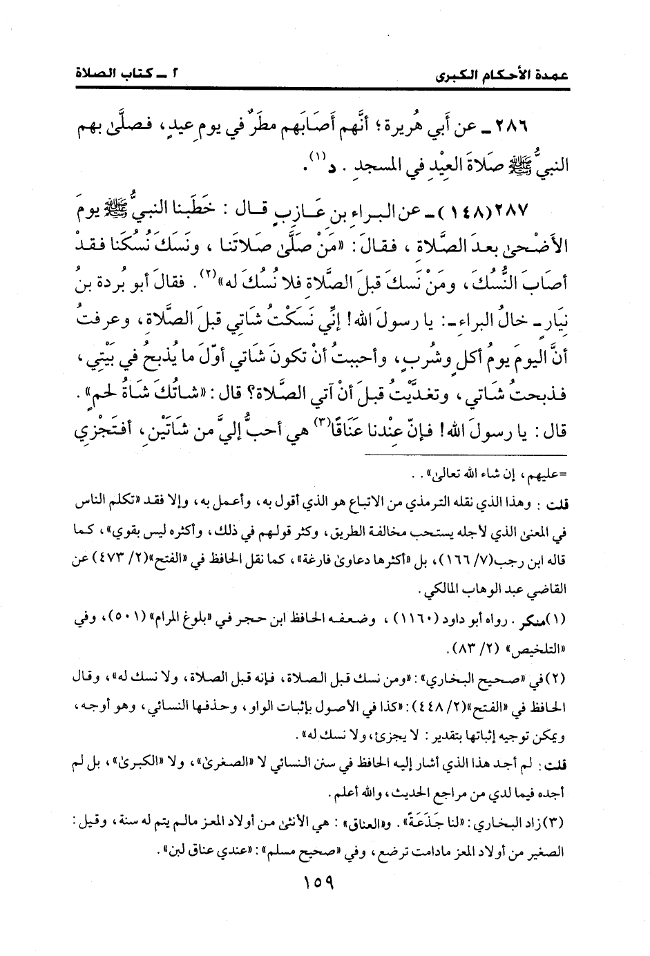 287) (148) - عن البراءِ بنِ عَازِبٍ قال: خَطَبنا النبيُّ - صلى الله عليه وسلم - يومَ الأَضْحى بعدَ الصَّلاةِ، فقالَ: "مَنْ صَلَّى صَلاتَنا، ونَسَكَ نُسُكَنا فقدْ أصَابَ النُّسُكَ، ومَنْ نَسكَ قبلَ الصَّلاةِ فلا نُسُكَ له" (¬2). فقالَ أبو بُردة بنُ نِيَار- خالُ البراءِ-: يا رسولَ الله! إني نَسَكْتُ شَاتِي قبلَ الصَّلاةِ، وعرفتُ أن اليومَ يومُ أكلٍ وشُربٍ، وأحببتُ أنْ تكونَ "شَاتُك أوّلَ ما يُذبحُ في بَيْتِي، فذبحتُ شَاتي، وتغدّيتُ قبلَ أنْ آتي الصَّلاة؟ قال: "شاتُكَ شَاةُ لحم".