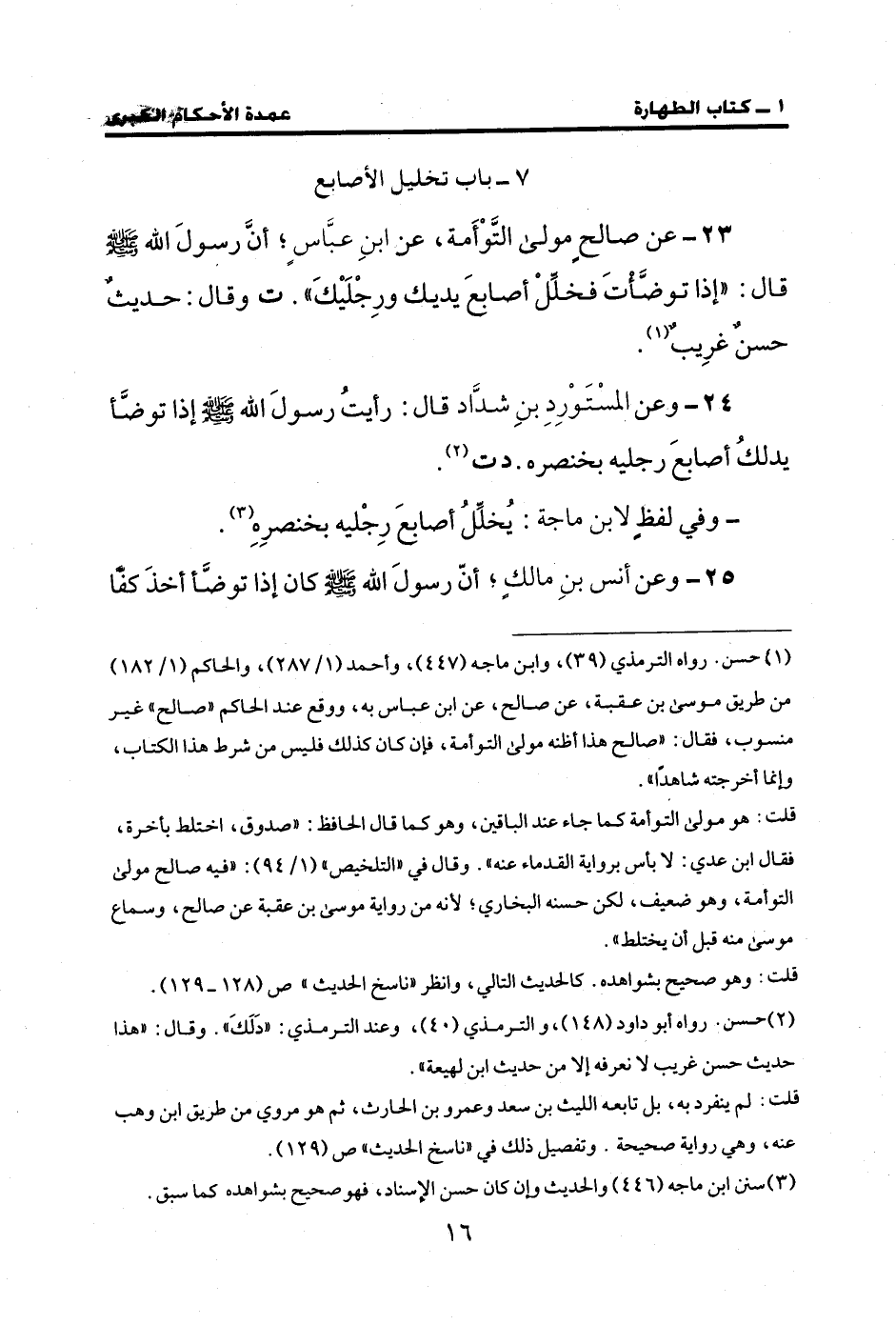 23 - عن صالحٍ مولى التَّوْأَمة، عن ابنِ عبَّاسٍ؛ أنَّ رسولَ الله - صلى الله عليه وسلم - قال: "إذا توضَّأتَ فخلِّلْ أصابعَ يديك ورِجْلَيْكَ". ت وقال: حديثٌ حسنٌ غرِيبٌ (¬1).