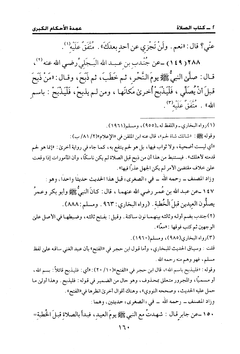 288) (149) - عن جُنْدبِ بنِ عبد الله البَجَلِي رضي الله عنه (¬2)، قال: صلَّى النبيُّ - صلى الله عليه وسلم - يومَ النَّحْر، ثم خَطَبَ، ثم ذَبَحَ، وقال: "مَنْ ذَبَحَ قبلَ أنْ يُصَلِّي، فَلْيَذْبَحْ أُخرى مَكانَها، ومن لم يذبحْ، فَلْيَذْبَحْ: باسمِ الله". مُتَّفَقٌ عَلَيْهِ (¬3).