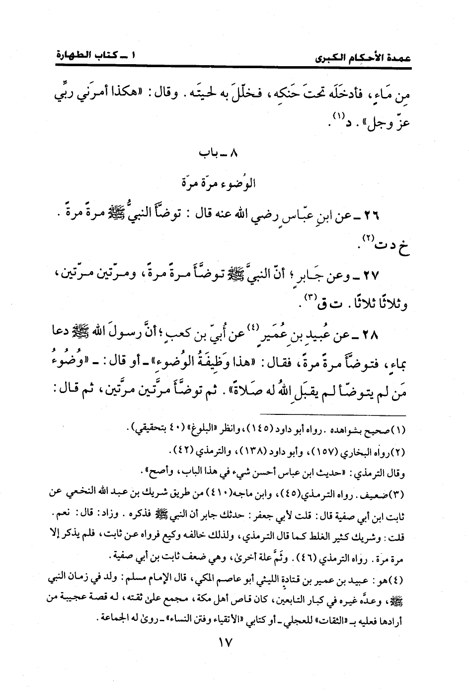 26 - عن ابنِ عبّاس رضي الله عنه قال: توضَّأَ النبيُّ - صلى الله عليه وسلم - مرةً مرةً. خ د ت (¬2).