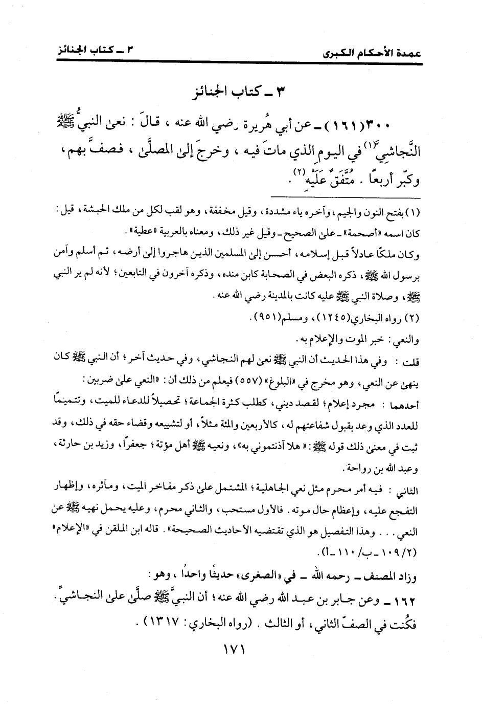300 (161) - عن أبي هُريرة رضي الله عنه، قالَ: نعى النبيُّ - صلى الله عليه وسلم - النَّجاشِيَّ (¬1) في اليومِ الذي ماتَ فيه، وخرجَ إلى المصلَّى، فصفَّ بهم، وكبّر أربعًا. متَّفَقٌ عَلَيْه (¬2).
