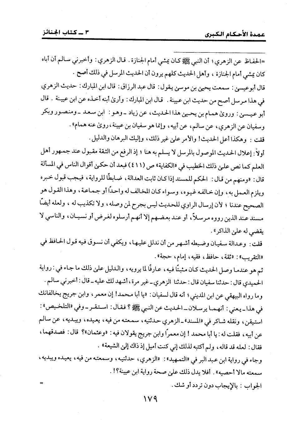 وما رواه البيهقي عن ابن المديني؛ أنه قال لسفيان: "يا أبا محمد! إن معمر، وابن جريج يخالفانك في هذا- يعني: أنهما يرسلان- الحديث عن النبي - صلى الله عليه وسلم -؟ فقال: استقر- وفي "التلخيص": استيقن، ونقله شاكر في "المسند"- الزهري حدثنيه، سمعته من فيه، يعيده، ويبديه، عن سالم عن أبيه، فقلت له: يا أبا محمد! إن معمرًا وابن جريج يقولان فيه: "وعثمان"؟ قالا: فصدقهما، فقال: لعله قد قاله، ولم أكتبه لذلك إني كنت أميل إذ ذاك إلي الشيعة".