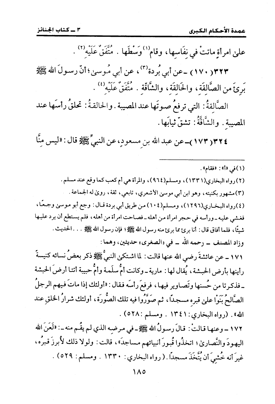 171 - عن عائشةَ رضي الله عنها قالت: لما اشتكى النبيَّ - صلى الله عليه وسلم - ذكر بعضُ نسائه كنيسة رأينها بأرض الحبشة، يُقال لها: مارية- وكانت أمُّ سلَمة وأمُّ حبيبة أتتا أرضَ الحبشة - فذكرتا من حُسنها وتَصاوير فيها، فرفعَ رأسَه فقال: "أولئك إذا ماتَ فيهم الرجلُ الصَّالحُ بَنَوْا على قبرهِ مسجدًا، ثم صَوَّرُوا فيه تلك الصُّورَة، أولئك شرارُ الخلقِ عند الله". (رواه البخاري: 1341. ومسلم: 528).