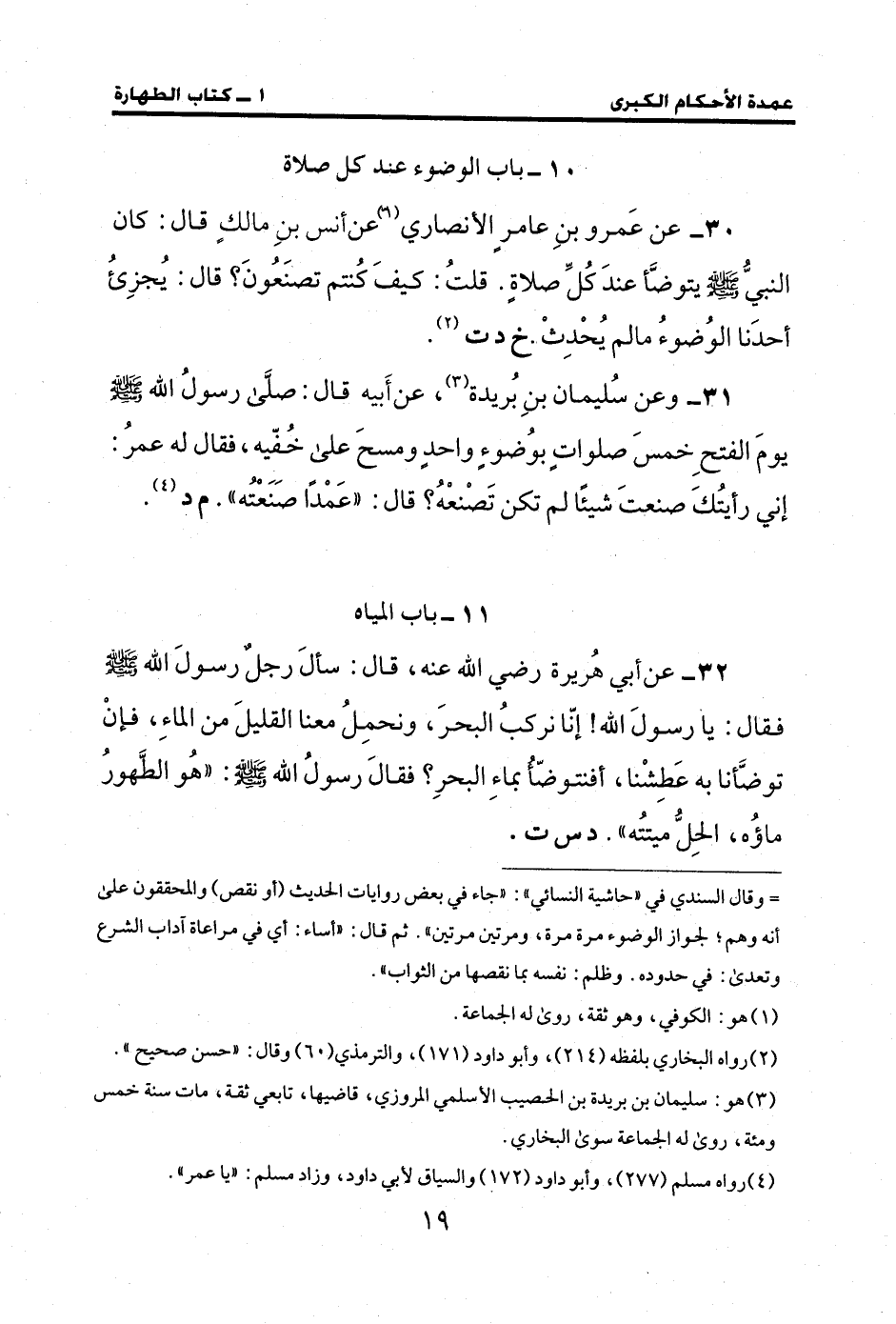 32 - عن أبي هُريرة رضي الله عنه، قال: سألَ رجلٌ رسولَ الله - صلى الله عليه وسلم - فقال: يا رسولَ الله! إنّا نركبُ البحرَ، ونحمِلُ معنا القليلَ من الماءِ، فإنْ توضَّأنا به عَطِشْنا، أفنتوضّأ بماءِ البحرِ؟ فقالَ رسولُ الله - صلى الله عليه وسلم -: "هُو الطَّهورُ ماؤُه، الحِلُّ ميتتُه". د س ت.