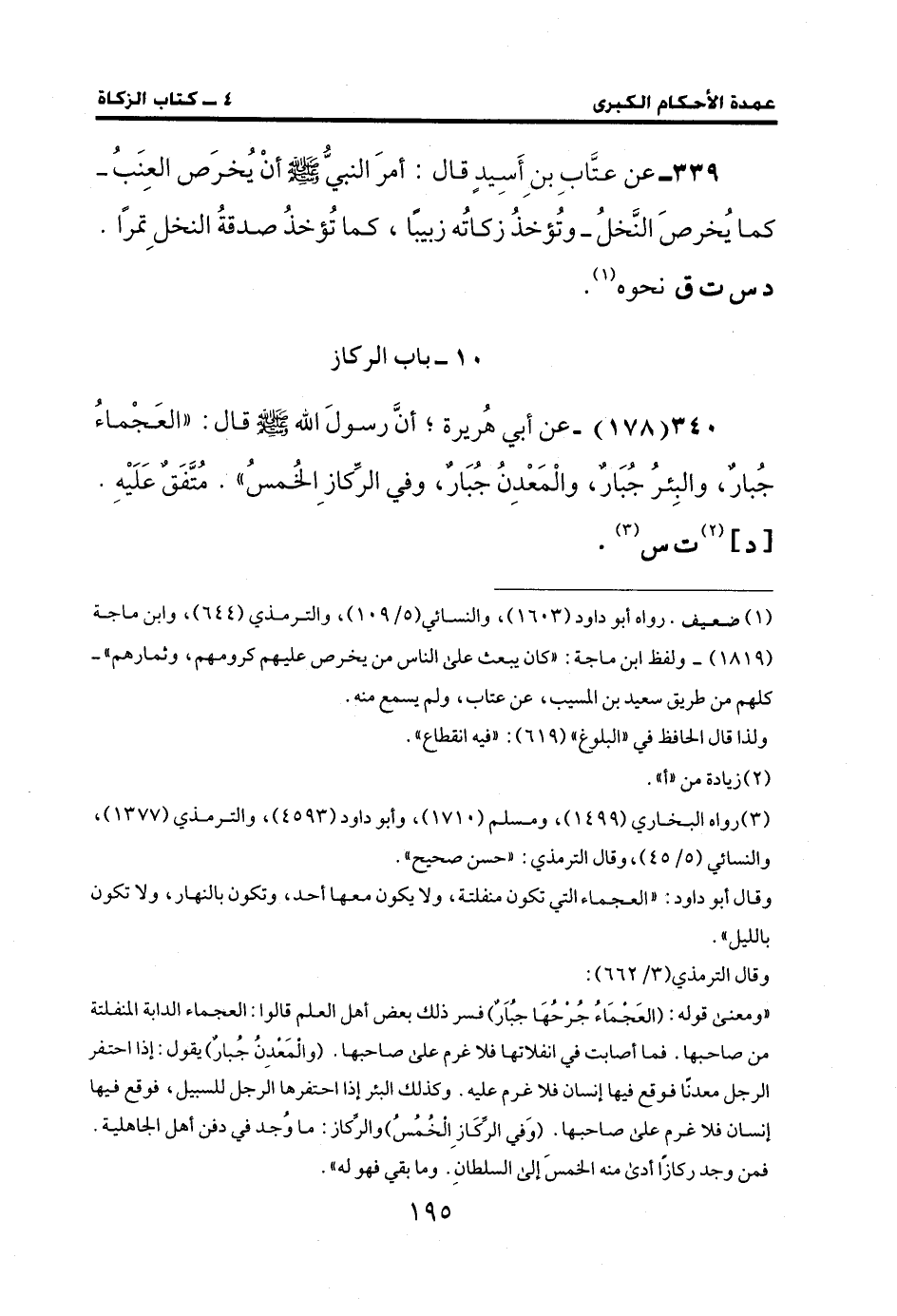 339 - عن عتَّابِ بن أِسِيدٍ قال: أمرَ النبيُّ - صلى الله عليه وسلم - أنْ يُخرَص العِنَبُ- كما يُخرصَ النَّخلُ- وتُؤخذُ زكاتُه زبيبًا، كما تُؤخذُ صدقةُ النخلِ تمرًا. د س ت ق نحوه (¬1).