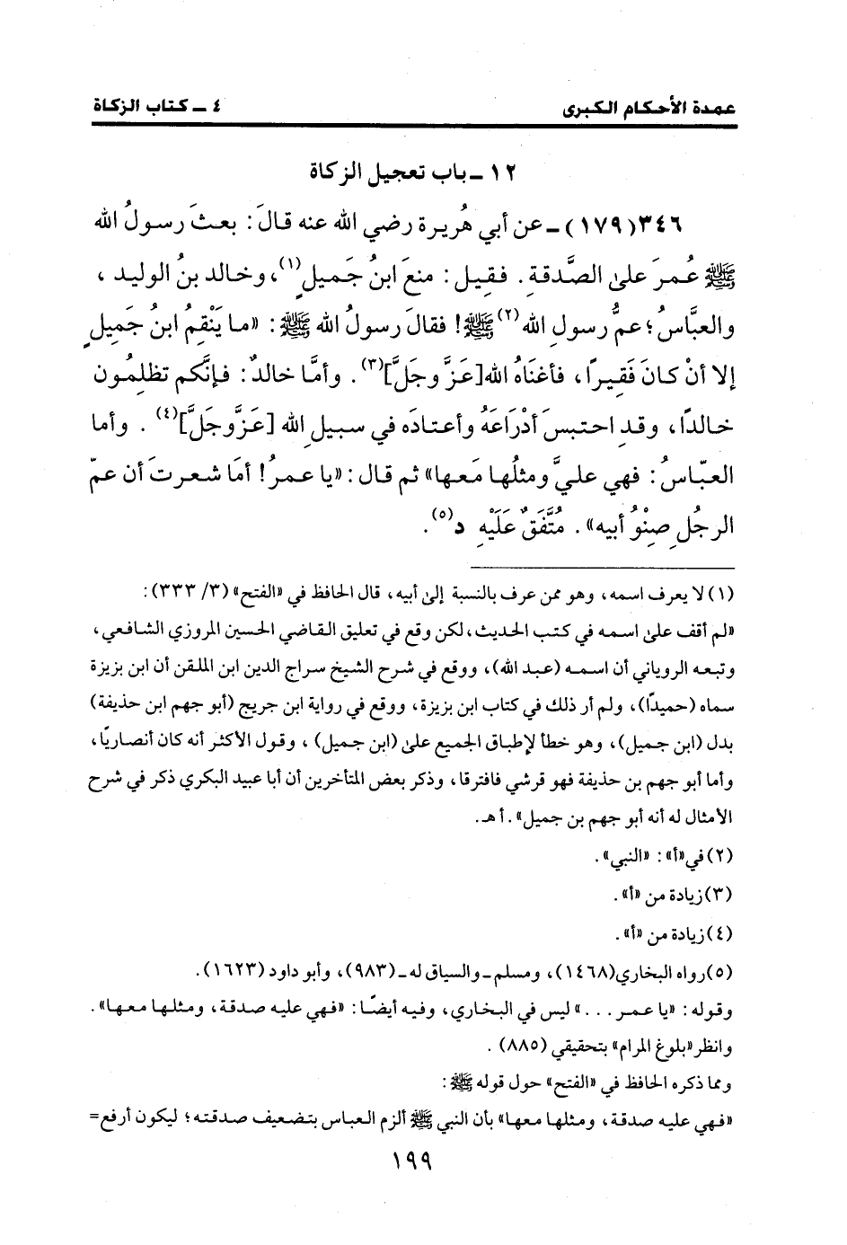 346 (179) - عن أبي هُريرة رضي الله عنه قالَ: بعثَ رسولُ الله - صلى الله عليه وسلم - عُمرَ على الصَّدقةِ. فقِيل: منعَ ابنُ جَميلٍ (¬1)، وخالد بنُ الوليد، والعبَّاسُ؛ عمُّ رسولِ الله (¬2) - صلى الله عليه وسلم - فقالَ رسولُ الله - صلى الله عليه وسلم -: "ما يَنْقِمُ ابنُ جَمِيلٍ إلا أنْ كانَ فَقِيرًا، فأغنَاهُ الله [عَزَّ وجَلَّ] (¬3). وأمَّا خالدٌ: فإنَّكم تظلِمُون خالدًا، وقدِ احتبسَ أدْرَاعَهُ وأعتادَه فى سبيلِ الله [عَزَّوجَلَّ] (¬4). وأما العبّاسُ: فهي عليَّ ومثلُها مَعها" ثم قال: "يا عمرُ! أمَا شعرتَ أن عمّ الرجُلِ صِنْوُ أبيه". مُتَّفَقٌ عَلَيْهِ د (¬5).