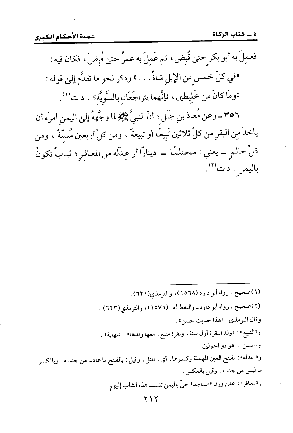 356 - وعن مُعاذ بن جَبَلٍ؛ أنّ النبيَّ - صلى الله عليه وسلم - لما وجَّههُ إلى اليمنِ أمرَه أن يأخذَ مِن البقرِ من كل ثلاثين تَبِيعًا أو تبيعة، ومن كلِّ أربعين مُسِنّةً، ومن كلِّ حالمٍ- يعني: محتلمًا- دينارًا أو عدْلَه من المعافرِ؛ ثيابٌ تكونُ باليمنَ. د ت (¬2).