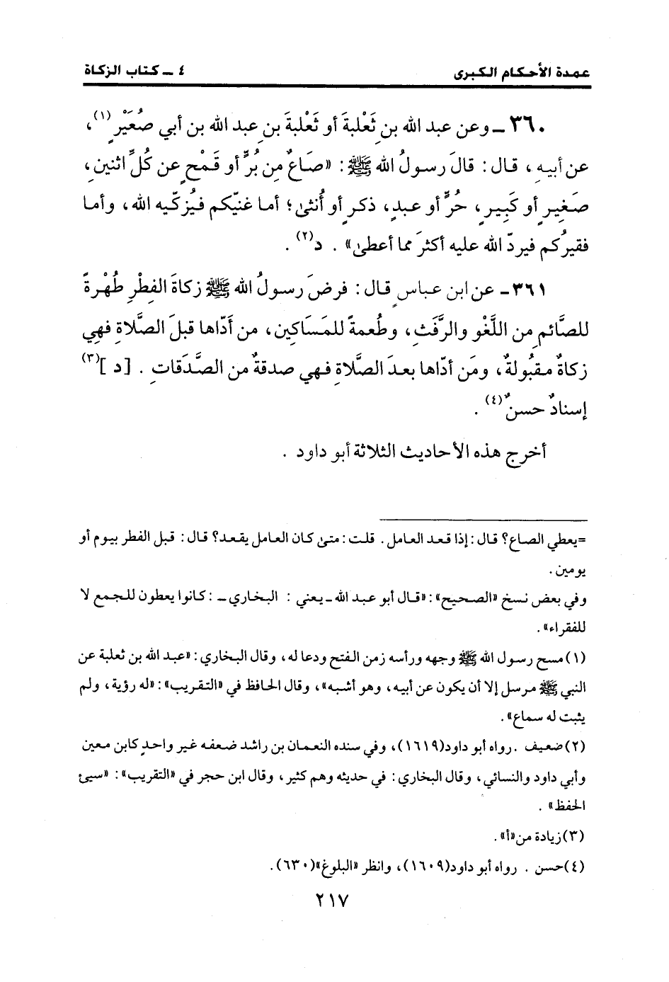 360 - وعن عبد الله بن ثَعْلبةَ أو ثَعْلبةَ بنِ عبد الله بن أبي صُعَيْرٍ (¬1)، عن أبيهِ، قال: قالَ رسولُ الله - صلى الله عليه وسلم -: "صَاعٌ مِن بُر أو قَمْح عن كُلِّ اثنين، صَغِيرٍ أو كَبِيرٍ، حُرٍّ أو عبدٍ، ذكر أو أُنثى؛ أما غنيّكم فيُزكّيه الله، وأما فقيرُكم فيردّ الله عليه أكثرَ مما أعطى". د (¬2).