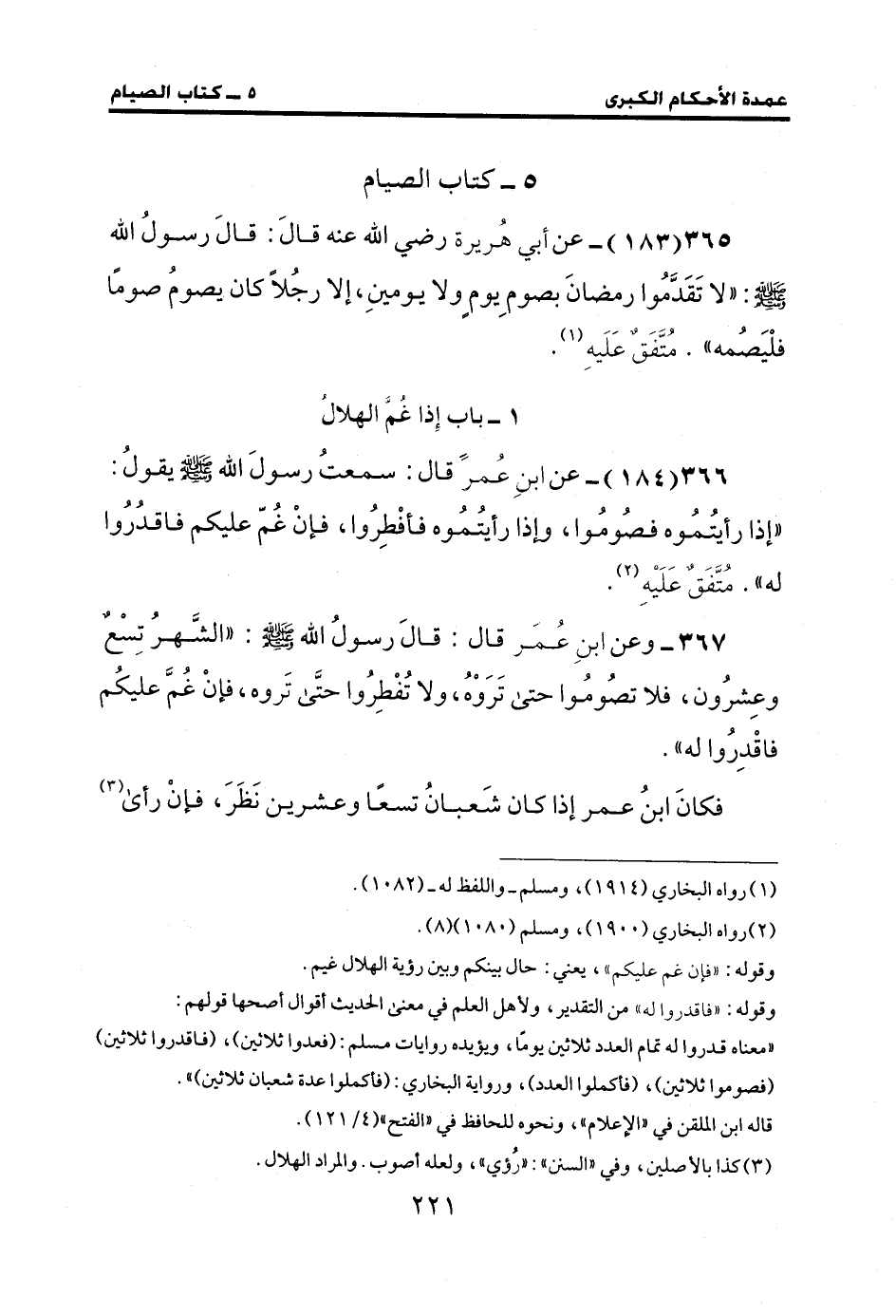 366 (184) - عن ابنِ عمر قال: سمعتُ رسولَ الله - صلى الله عليه وسلم - يقولُ: "إذا رأيتُمُوه فصُومُوا، وإذا رأيتُمُوه فأفْطِرُوا، فإنْ غُمّ عليكم فاقدُرُوا له". متَّفَق عَلَيْهِ (¬2).