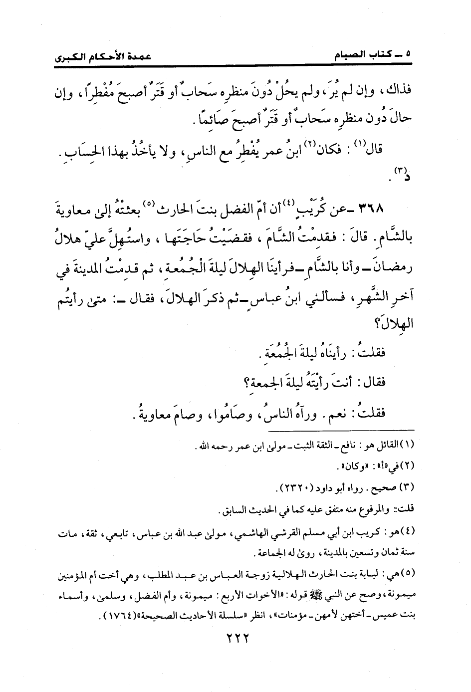 368 - عن كُرَيْبٍ (¬4) أن أمّ الفضل بنتَ الحارث (¬5) بعثتْهُ إلى معاويةَ بالشَّامِ. قالَ: فقدِمْتُ الشَّامَ، فقضَيْتُ حَاجَتَها، واستُهِلَّ عليّ هلالُ رمضانَ -وأنا بالشَّامِ - فرأينَا الهِلالَ ليلةَ الْجُمُعةِ، ثم قدِمْتُ المدينةَ في آخرِ الشَّهرِ، فسألني ابنُ عباسٍ -ثم ذكرَ الهلالَ، فقال-: متى رأيتُم الهِلالَ؟