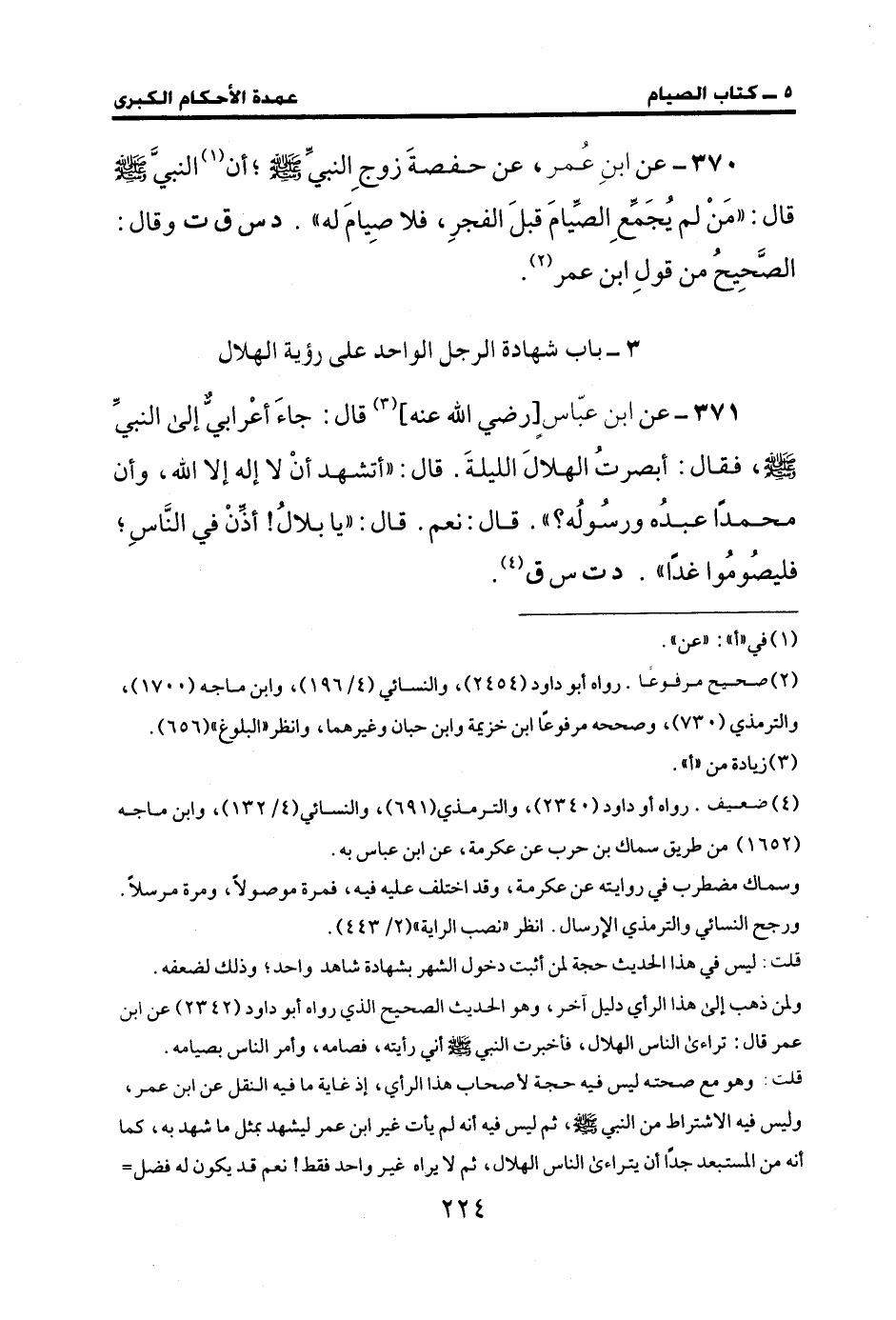 371 - عن ابن عبّاسٍ [رضي الله عنه] (¬3) قال: جاءَ أعْرابيٌّ إلى النبيِّ - صَلَّى الله عليه وسلم -، فقال: أبصرتُ الهلالَ الليلةَ. قال: "أتشهد أن لا إله إلَّا الله، وأن محمدًا عبدُه ورسُولُه؟ ". قال: نعم. قال: "يا بلالُ! أذِّن في النَّاسِ؛ فليصُومُوا غدًا". د ت س ق (¬4).