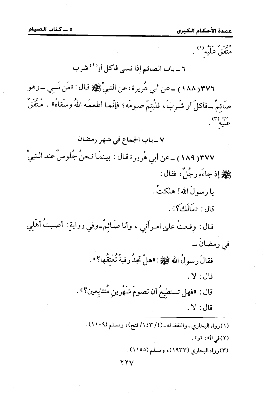 376 (188) - عن أبي هُريرة، عن النبيِّ - صلى الله عليه وسلم - قال: "مَن نَسِي- وهو صَائِمٌ- فأكلَ أو شَرِبَ، فليُتِمّ صومَه؛ فإنّما أطعمَه اللهُ وسَقاهُ". مُتَّفَقٌ عَلَيْهِ (¬3).