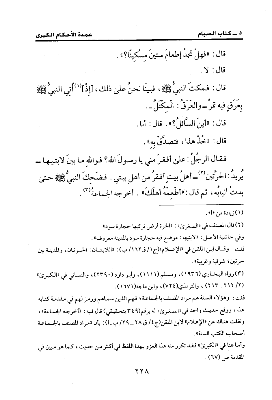 فقال الرجُلُ: على أفقرَ مني يا رسولَ الله؟ فواللهِ ما بينَ لابتيها- يُريدُ: الحرَّتين (¬2) - أهلُ بيتٍ أفقرُ من أهل بيتي. فضَحِكَ النبيُّ - صَلَّى الله عليه وسلم - حتَّى بدتْ أنيابُه، ثم قال: "أطْعِمْهُ أهلَكَ". أخرجه الجماعةُ (¬3).