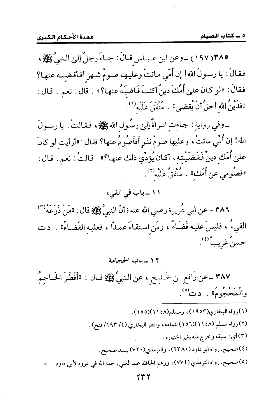 386 - عن أبي هُريرة رضي الله عنه؛ أنّ النبيَّ - صَلَّى الله عليه وسلم - قال: "مَنْ ذَرَعَهُ (¬3) القيءُ، فليسَ عليه قَضَاءٌ، ومَن استقاءَ عمدًا، فعليه القَضاءُ". د ت حسنٌ غرِيبٌ (¬4).