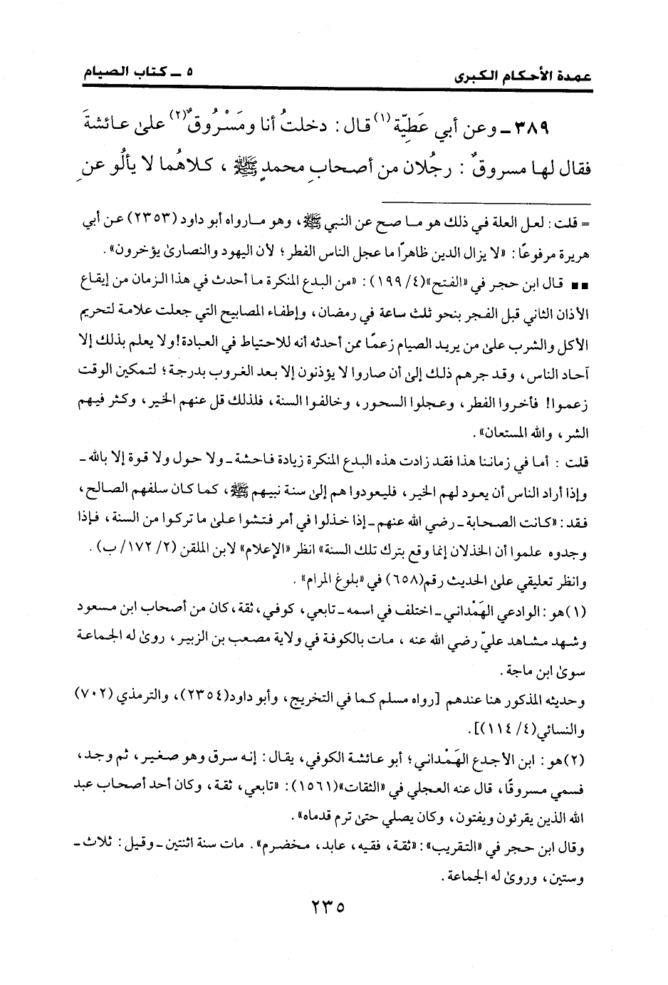 389 - وعن أبي عَطِيّة (¬1) قال: دخلتُ أنا ومَسْرُوقٌ (¬2) على عائشةَ فقال لها مسروقٌ: رجُلان من أصحابِ محمدٍ - صلى الله عليه وسلم -، كلاهُما لا يألُو عنِ