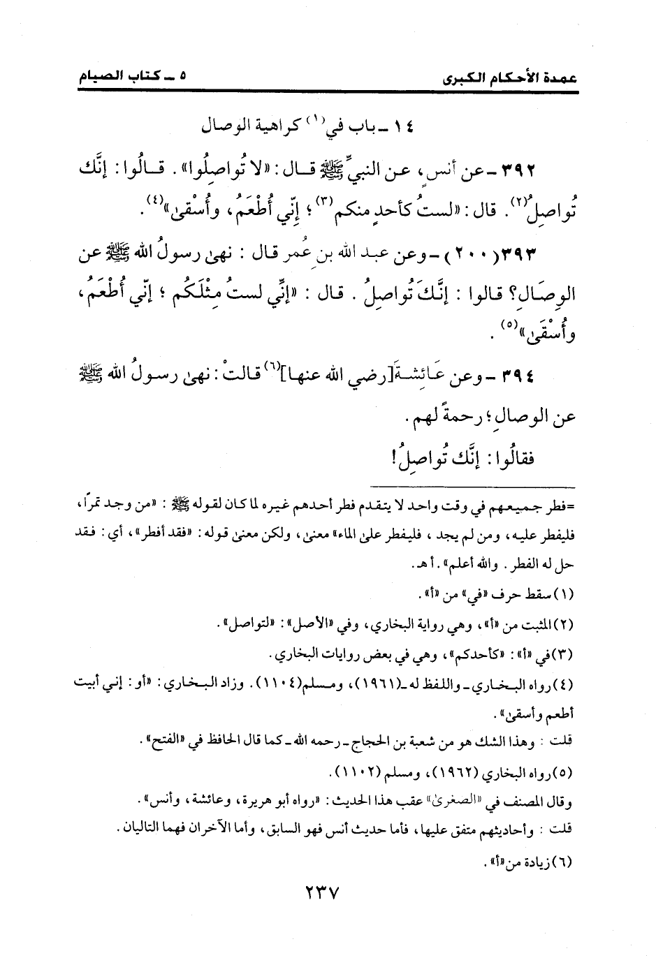 392 - عن أنسٍ، عن النبيِّ - صلى الله عليه وسلم - قال: "لا تُواصِلُوا". قالُوا: إنَّك تُواصِلُ (¬2). قال: "لستُ كأحدٍ منكم (¬3)؛ إِنّي أُطْعَمُ، وأُسْقى" (¬4).