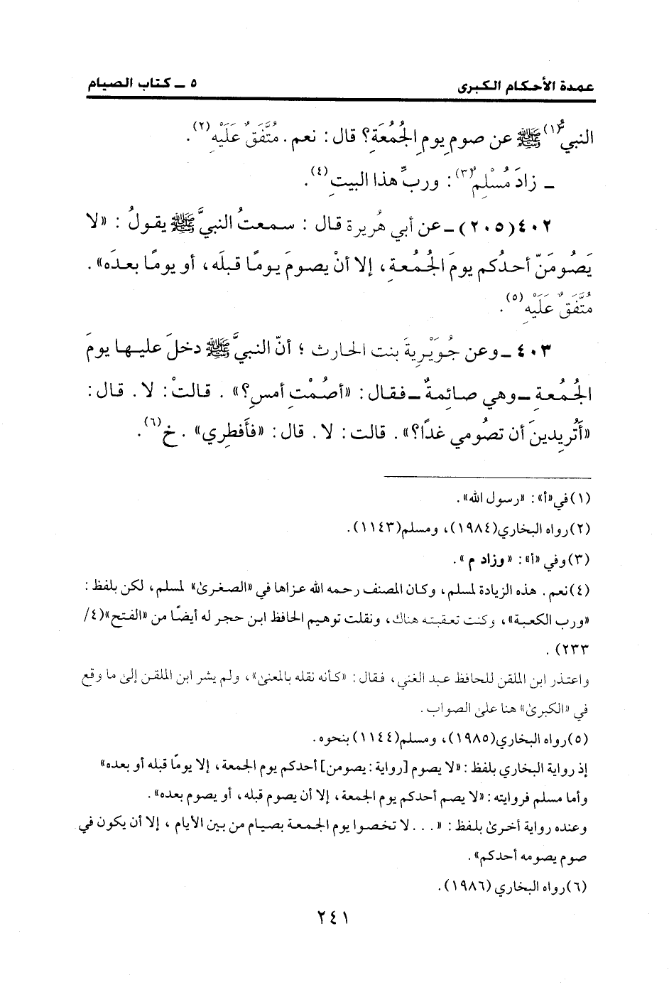 402 (205) - عن أبي هريرة قال: سمعتُ النبيَّ - صلى الله عليه وسلم - يقولُ: "لا يَصُومَنّ أحدُكم يومَ الجُمُعةِ، إلا أنْ يصومَ يومًا قبلَه، أو يومًا بعدَه". مُتَّفَقٌ عَلَيْهْ (¬5).