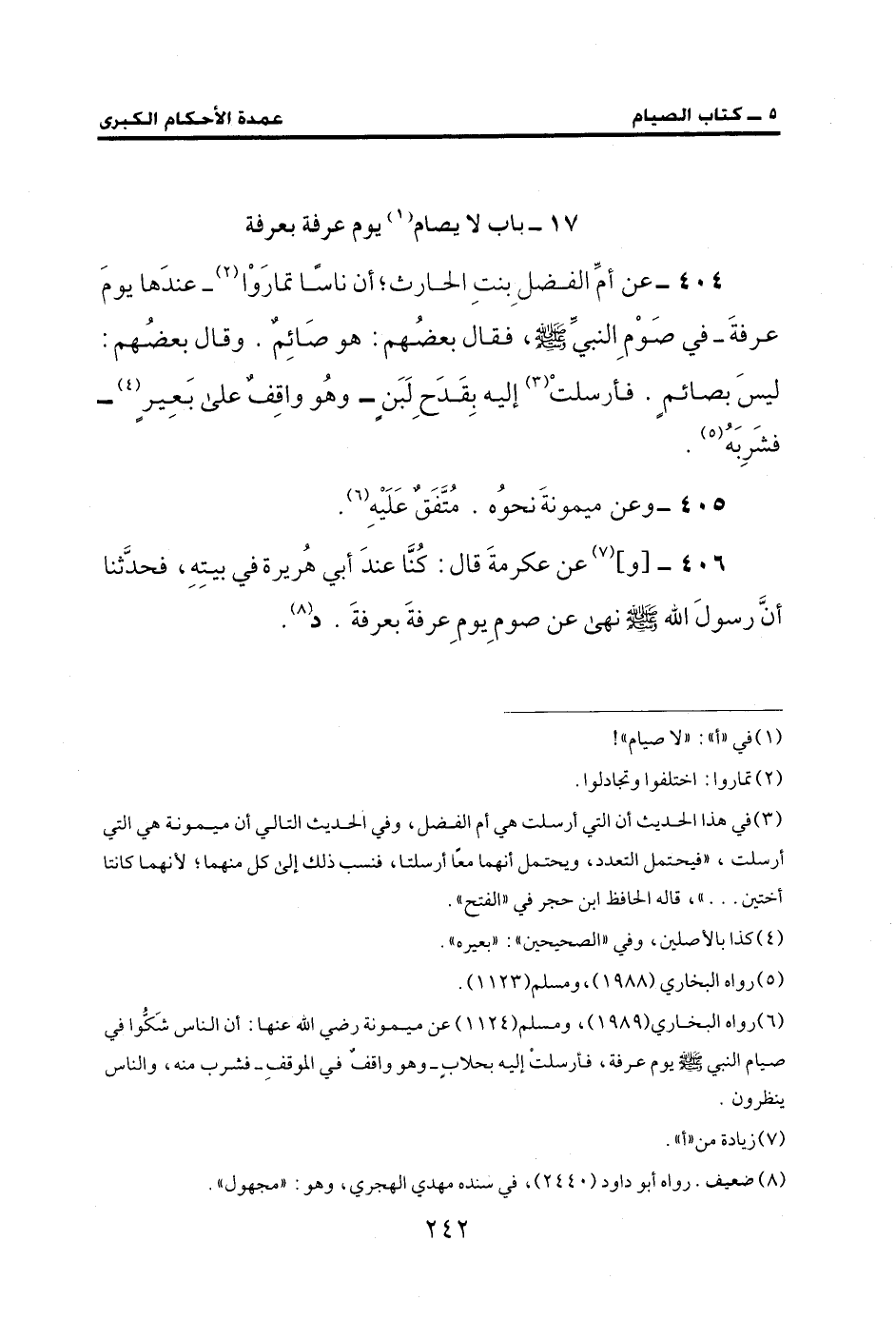 404 - عن أمِّ الفضلِ بنتِ الحارث؛ أن ناسًا تمارَوْا (¬2) -عندَها يومَ عرفةَ- في صَوْمِ النبيِّ - صلى الله عليه وسلم -، فقال بعضُهم: هو صَائِمٌ. وقال بعضُهم: ليسَ بصائمٍ. فأرسلتْ (¬3) إليه بِقَدَحِ لَبَنٍ - وهُو واقِفٌ على بَعِير (¬4) - فَشَرِبَهُ (¬5).