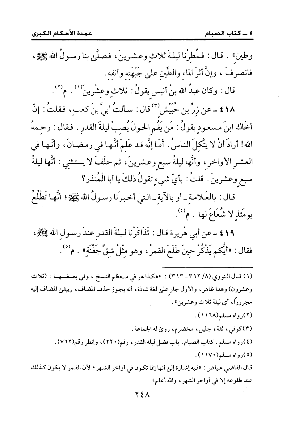 418 - عن زِرِّ بن حُبَيْش (¬3) قال: سألتُ أبيَ بنَ كعب، فقلتُ: إنَّ أخَاك ابنَ مسعودٍ يقول: مَن يَقُمِ الحولَ يُصِبْ ليلةَ القدرِ. فقال: رحِمهُ الله! أرادَ أنْ لا يتَّكِلَ الناسُ. أَمَا إنَّه قد عَلِمَ أنَّها في رمضانَ، وأنّها في العشرِ الأواخر، وأنَّها ليلةُ سبعٍ وعشرينَ، ثم حلَفَ لا يستثنِي: أنَّها ليلةُ سبعٍ وعشرينَ. قلتُ: بأيّ شيءٍ تقولُ ذلكَ يا أبا الْمُنذر؟