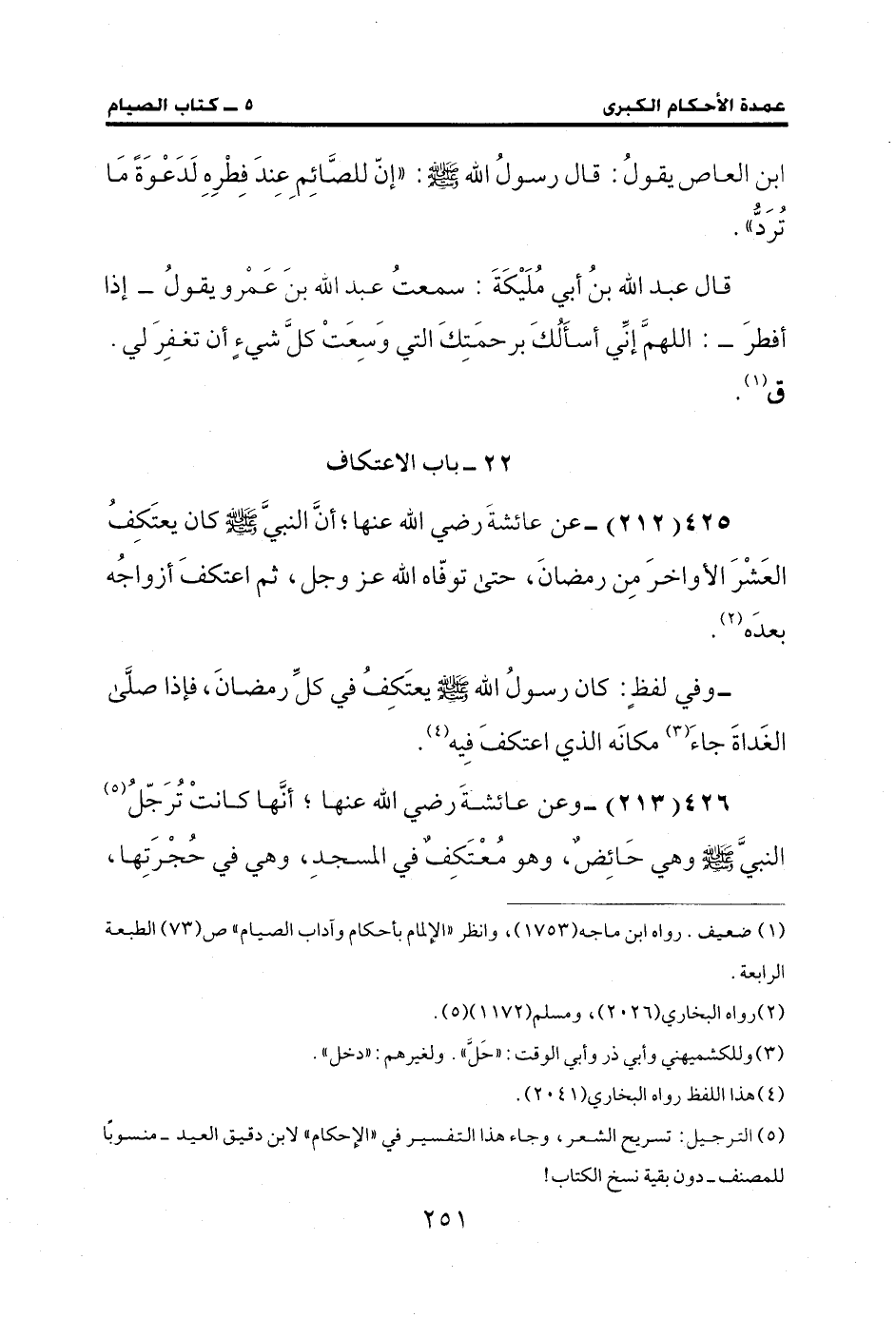 425 (212) - عن عائشةَ رضي الله عنها؛ أن النبي - صلى الله عليه وسلم - كان يعتَكِفُ العَشْرَ الأواخرَ مِن رمضانَ، حتى توفّاه الله عز وجل، ثم اعتكفَ أزواجُه بعدَه (¬2).