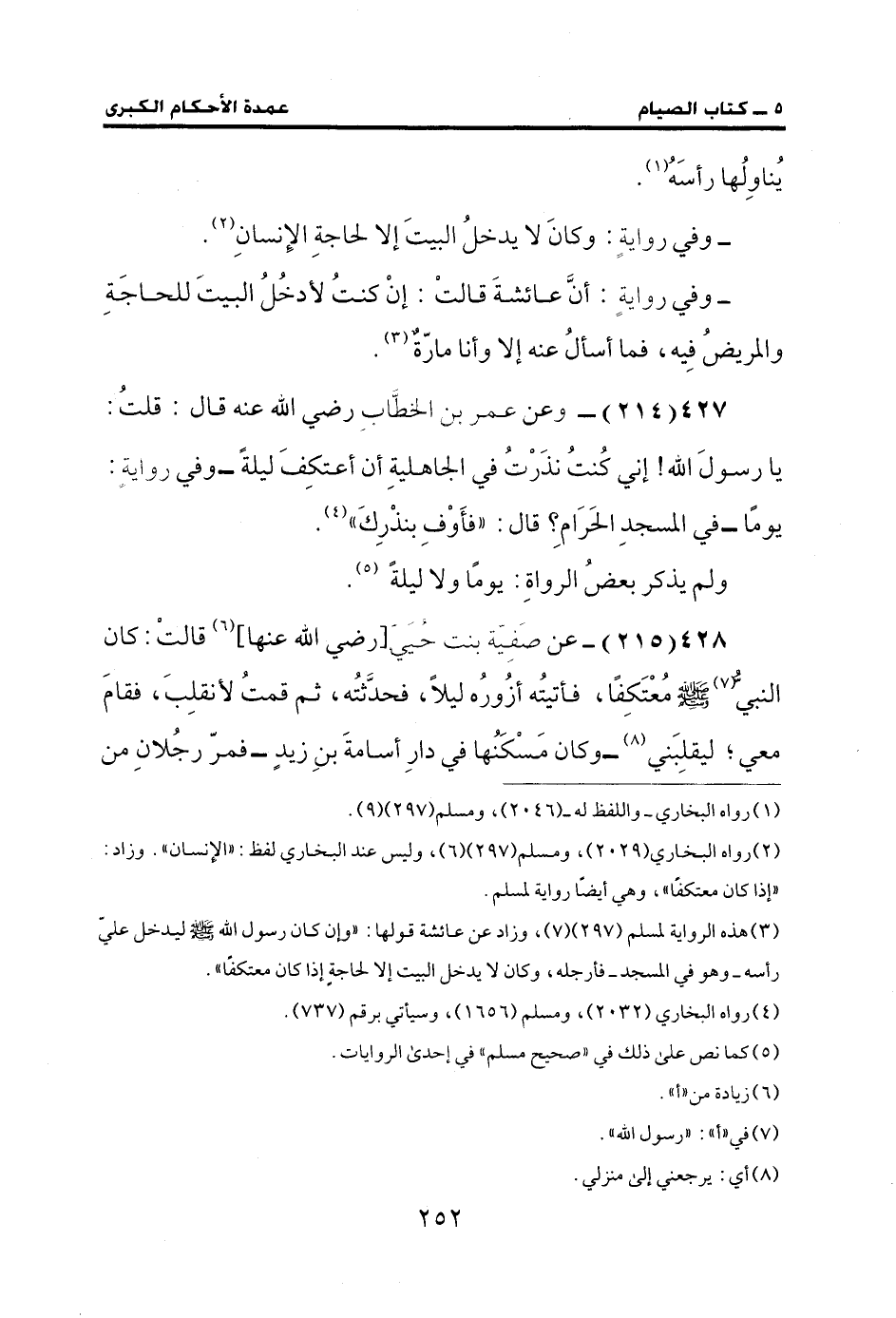 (¬3) هذه الرواية لمسلم (297) (7)، وزاد عن عائشة قولها: "وإن كان رسول الله - صلى الله عليه وسلم - ليدخل عليّ رأسه- وهو في المسجد- فأرجله، وكان لا يدخل البيت إلا لحاجة إذا كان معتكفًا".