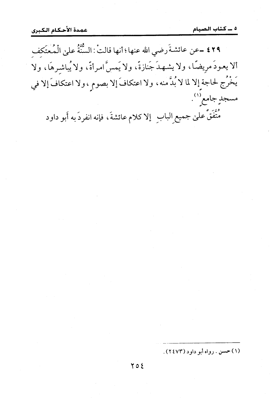 429 - عن عائشةَ رضي الله عنها؛ أنها قالتْ: السُّنَّةُ علي الْمُعتَكِفِ ألا يعودَ مرِيضًا، ولا يشهدَ جَنازةً، ولا يَمسَّ امرأةً، ولا يُباشِرهَا، ولا يَخْرُج لحاجة إلا لما لا بُدَّ منه، ولا اعتكافَ إلا بصومٍ، ولا اعتكافَ إلا في مسجدٍ جامعٍ (¬1).