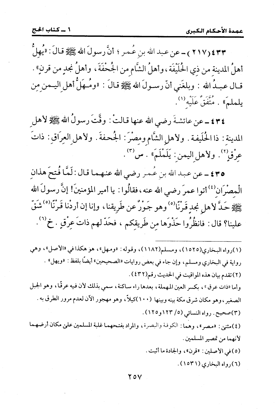 433 (217) - عن عبد الله بنِ عمر؛ أنَّ رسولَ الله - صلى الله عليه وسلم - قالَ: "يُهِلُّ أهلُ المدينةِ من ذِي الحُلَيْفَة، وأهلُ الشَّامِ من الجُحْفَةَ، وأهلُ نجدٍ من قرنٍ".