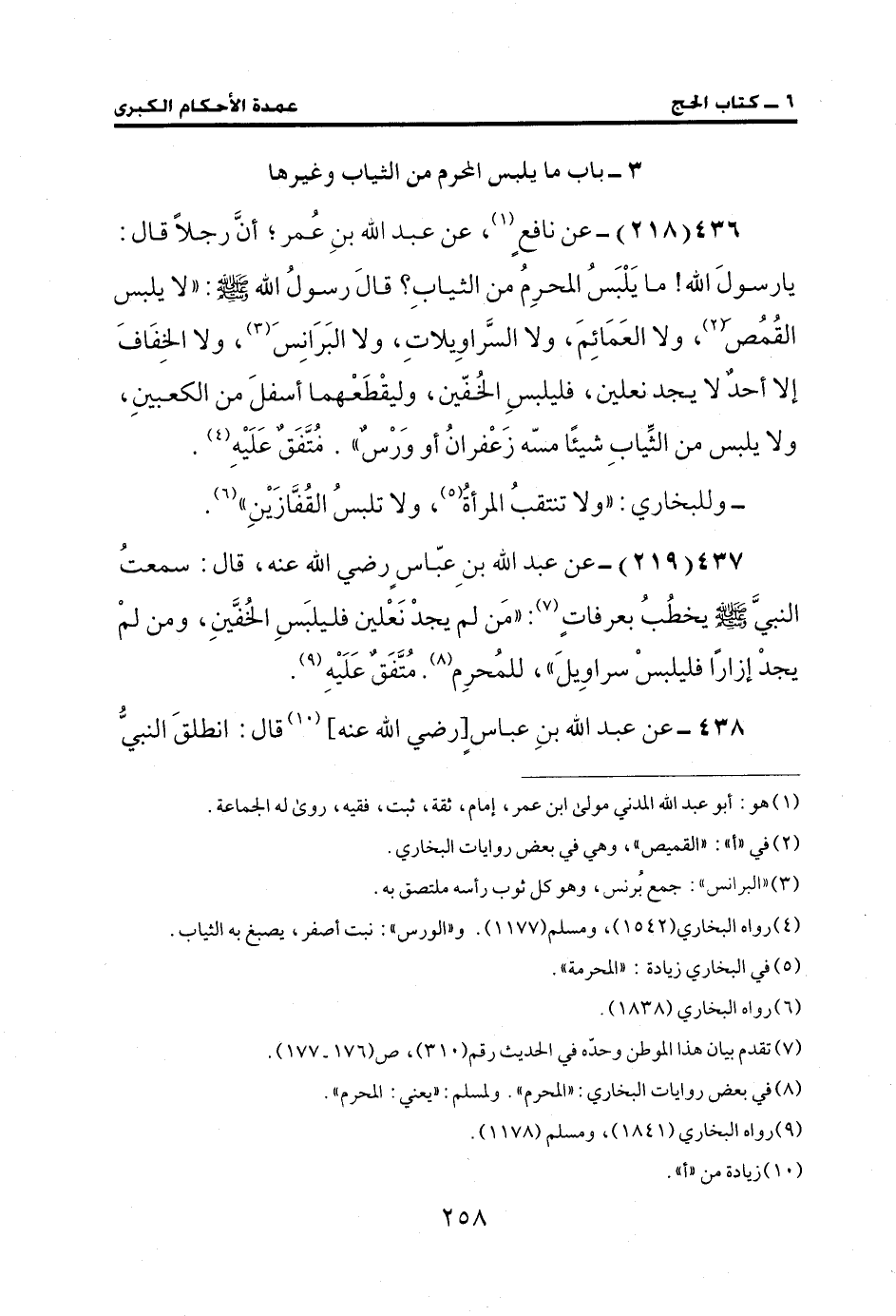 437 (219) - عن عبد الله بنِ عبّاس رضي الله عنه، قال: سمعتُ النبيَّ - صلى الله عليه وسلم - يخطُبُ بعرفاتٍ (¬7): "مَن لم يجدْ نَعْلين فليلبَسِ الخُفَّينِ، ومن لمْ يجدْ إزارًا فليلبسْ سراوِيلَ"، للمُحرِم (¬8). مُتَّفَقٌ عَلَيْهِ (¬9).