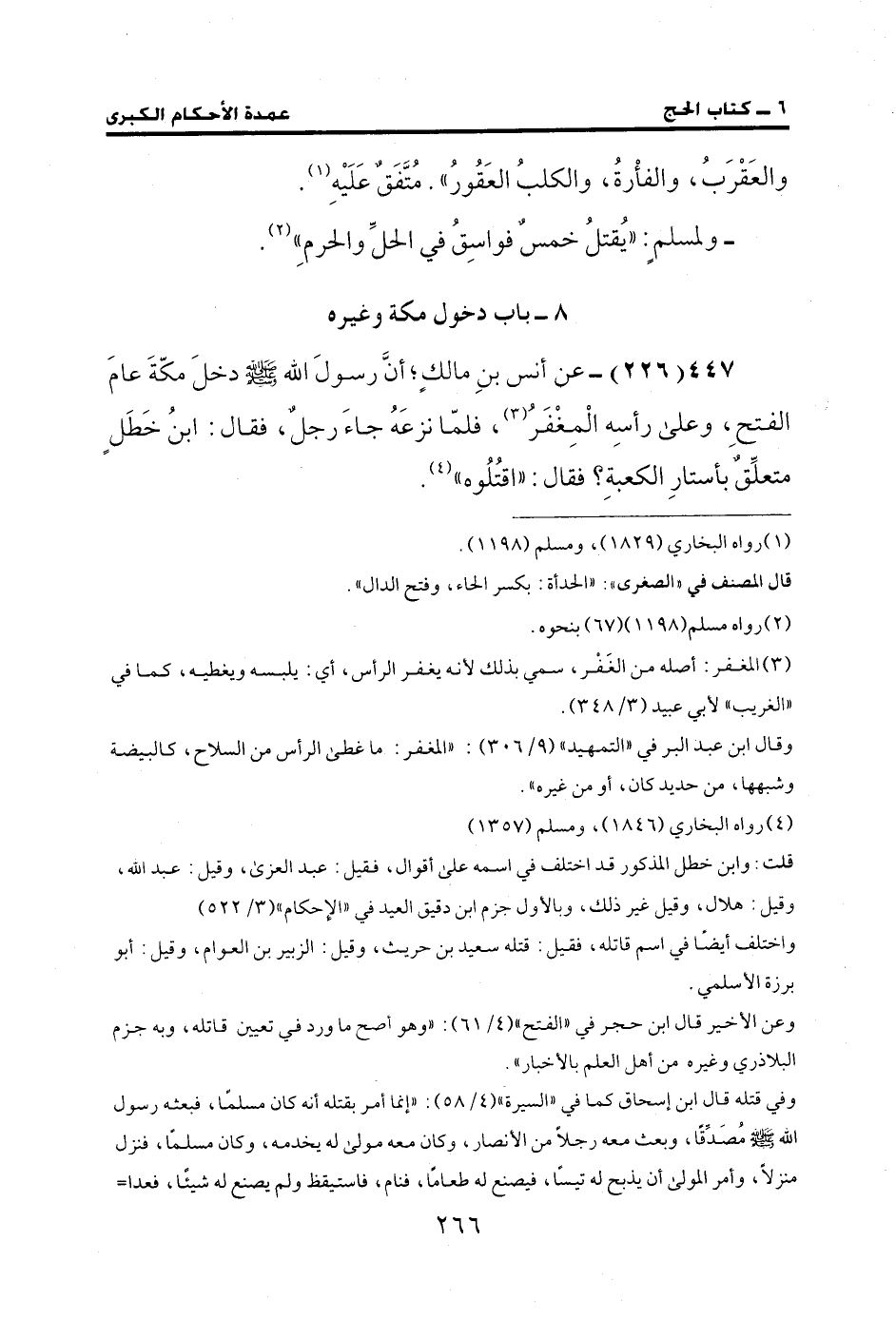 447 (226) - عن أنس بنِ مالكٍ؛ أن رسولَ الله - صلى الله عليه وسلم - دخلَ مكّةَ عامَ الفتح، وعلى رأسِه الْمِغْفَرُ (¬3)، فلمّا نزعَهُ جاءَ رجلٌ، فقال: ابنُ خَطَلٍ متعلِّقٌ بأستارِ الكعبةِ؟ فقال: "اقتُلُوه" (¬4).