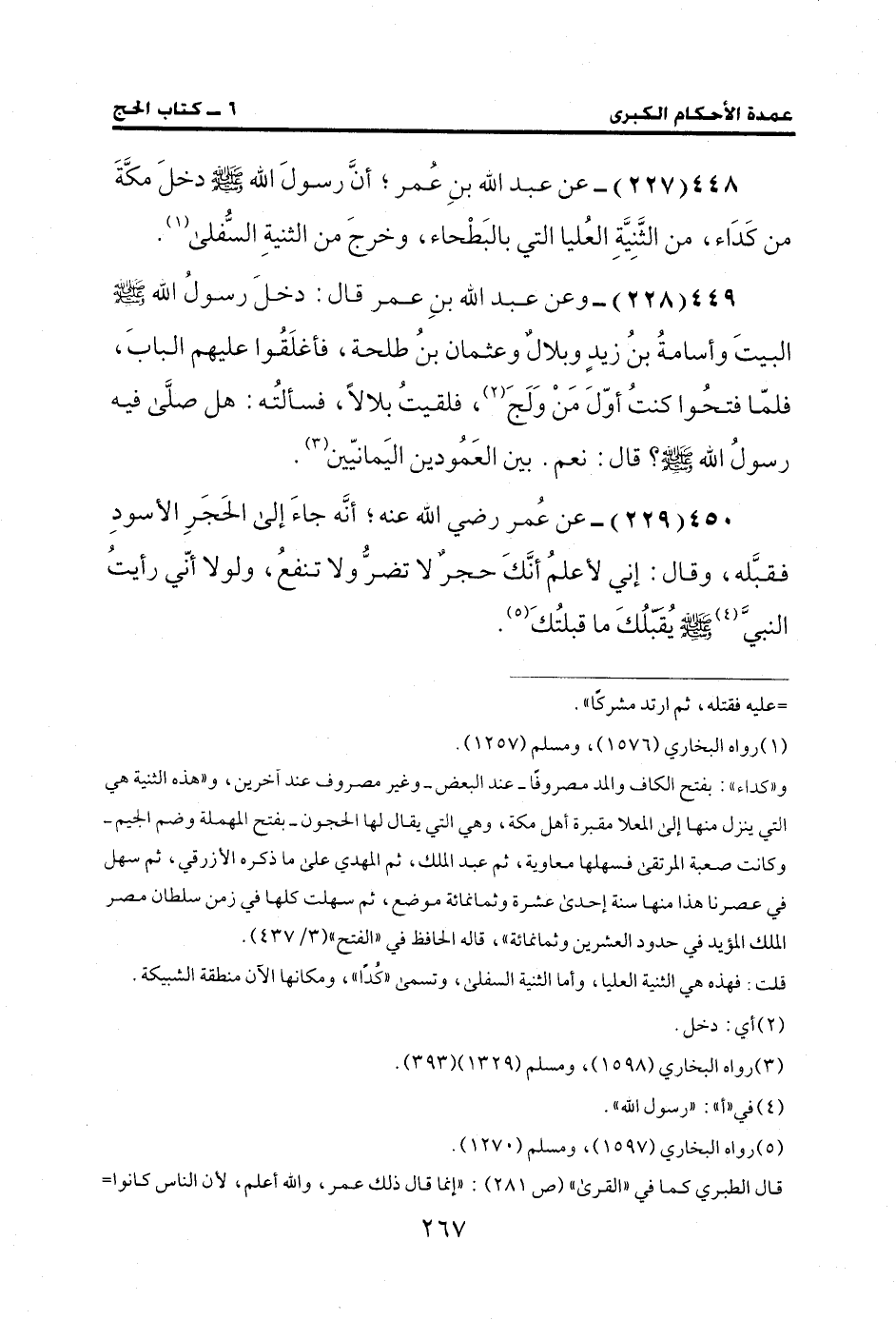 448 (227) - عن عبد الله بنِ عُمر؛ أنَّ رسولَ الله - صلى الله عليه وسلم - دخلَ مكَّةَ من كَدَاء، من الثَّنِيَّةِ العُليا التي بالبَطْحاء، وخرجَ من الثنيةِ السُّفلى (¬1).